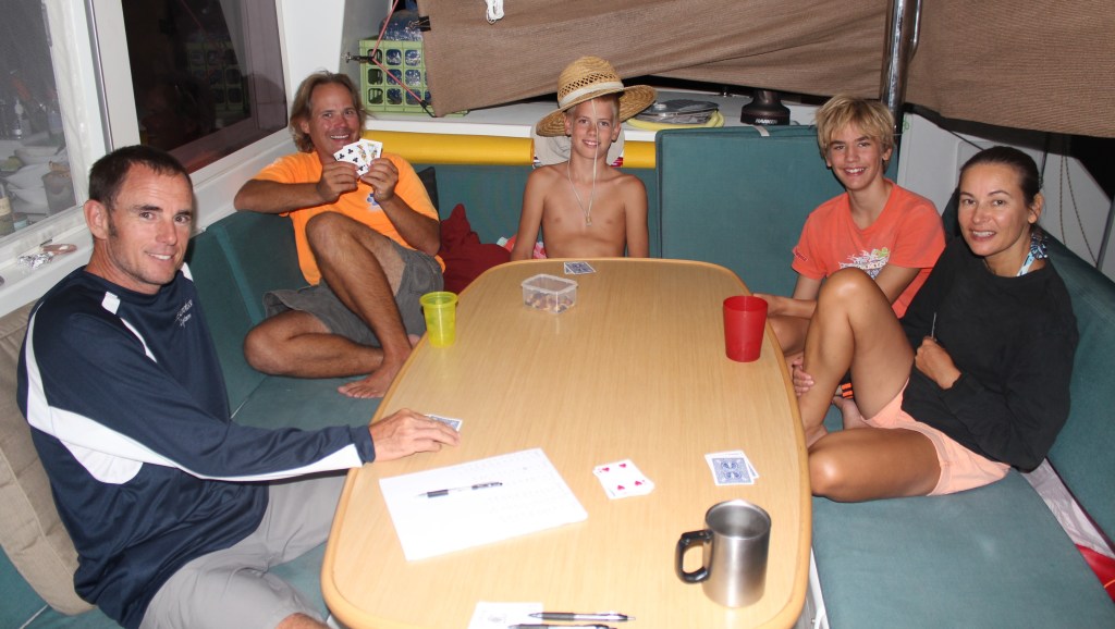 Our sail from Alcatrz to Refugio the next day was pretty uneventful and we joined Charra in the Middle bight of the East bay. After being in BLA village for several days the guys were all itching to get in the water with spears and guns, and I’m not kidding, they suited up and dropped the dinghy in record time. Bob and Joyce were having us all over for dinner on Charra that night, and they asked about taking fish out of the freezer just in case, but we (Carolina and I) were pretty confident they wouldn’t come back empty handed. And they didn’t. We had a great evening eating, drinking, and talking, and Joyce brought out a deck of cards for the kids, so they could stay entertained as well.