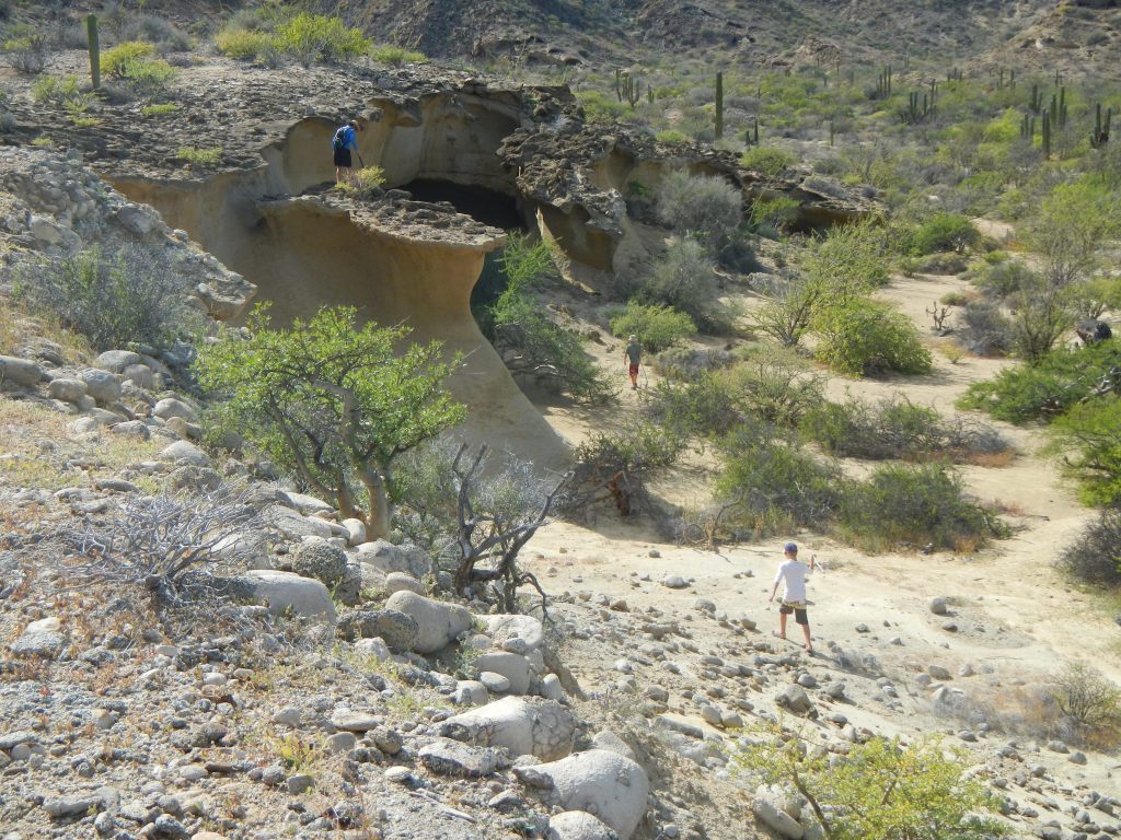 We had a gusty sail from Nopolo to Puerto Escondido, and we dropped anchor quickly. We could see Lady Carolina way out on one of the mooring balls but the dinghy was up, and we suspected they still weren’t back yet. We headed to shore to try and catch the tail end of the much publicized yacht club anniversary pizza party, but we ran into some acquaintances who told us we had missed it, but that we really didn’t miss much. As we were chatting our handheld VHF lit up, “Exodus, Exodus, Lady Carolina.” They’re back! We helped them empty their car, and they had to be just as creative at loading their car as I had to be. Unfortunately all this was happening around dusk, and we got thoroughly munched on by the all the mosquitos. Everyone was pretty tired, so we had an early night, but the next day we all ventured up the road away from the harbor, across the highway, and up into what is known as “Steinbeck’s Canyon.” Wow, what a hike. Unlike our previous hikes that had been along trails, this was really more like boulder hopping, with a stream running down the middle. The boys had an absolute blast, and they all showed their mountain goat skills as we got higher and higher and had to be creative about finding routes to keep moving up. On the way back down we stopped at a small pool, and Tim started undressing. I was too far away to hear the conversation between Steve and Tim, but soon Steve started also undressing. In their underwear, they moved over to the edge of the rocks above the pool, still bantering back and forth but I couldn’t hear what they were saying. A countdown commenced, and holy crap, they jumped in. Surely, they each thought the other was bluffing? Well, either way, that broke the ice, and pretty soon all the boys were taking turns jumping in and having a fantastic time. I think that hike goes down as one of the boys’ favorite days of our trip so far.