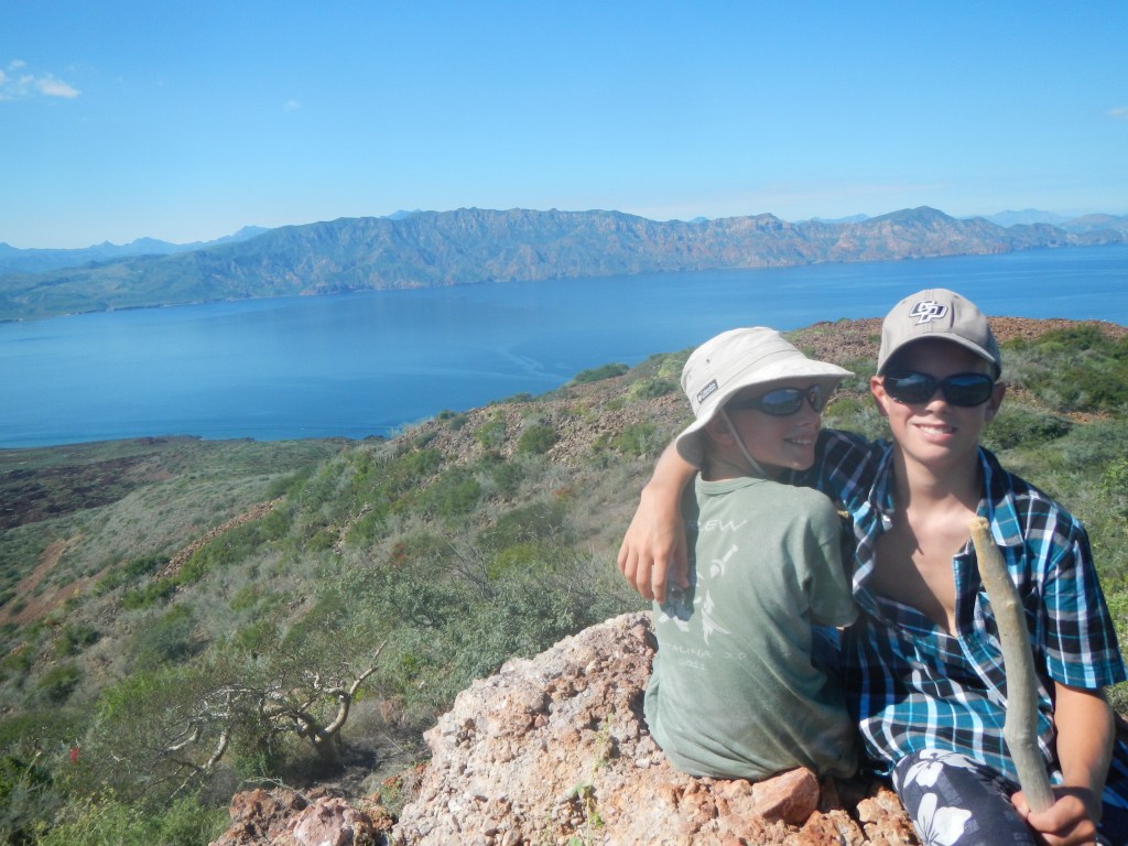 Initially, we were the only boat in the anchorage, but we were eventually joined by a power boat called Amiga with a really nice couple on board whom we played a game of beach bocce ball with. Here, we heard the “crazy fish” belly flops for the first time in I don’t know how long. It was like coming home to something familiar and comforting, those crazy rays. The water was crystal clear, and although I didn’t snorkel I paddle boarded around the edge of the anchorage and enjoyed the water from above. Tim went out and caught 4 langostas (lobsters) so we enjoyed that on the BBQ like old times, not quite as fun as with Lady Carolina, though. Tim and I left the boys on board for an afternoon and hiked up to the top of the pulpit. It wasn’t a very strenuous hike, and the views were absolutely amazing! On our way up the coast we had stayed on the north side of Punta Pulpito (Bahia San Nicolas) and we could see that entire bay from way up there. We had intended to stay at this anchorage only a night or two and then head down to San Juanico, but we kept hearing on the SSB nets that there were something like 17-23 boats there, so we extended our stay at Pulpito a bit longer. Our last night we were abruptly awakened by another boat making VHF calls at 3am. They had come into the anchorage to avoid some weather, and they were calling their buddy boat to let them know. That’s totally the kind of thing the radio is for, so no hard feelings or anything, but that was our clue that it was time to move on. We were clearly back in cruising civilization again so we might as well embrace it and join the crowd at San Juanico. You see, it was the time of year that everyone who left for the summer starts coming back for the fall and winter cruising seasons. A lot of people keep their boats in San Carlos, so we were getting caught up in the traffic of the people crossing the sea from San Carlos to the Chivato and heading south.
