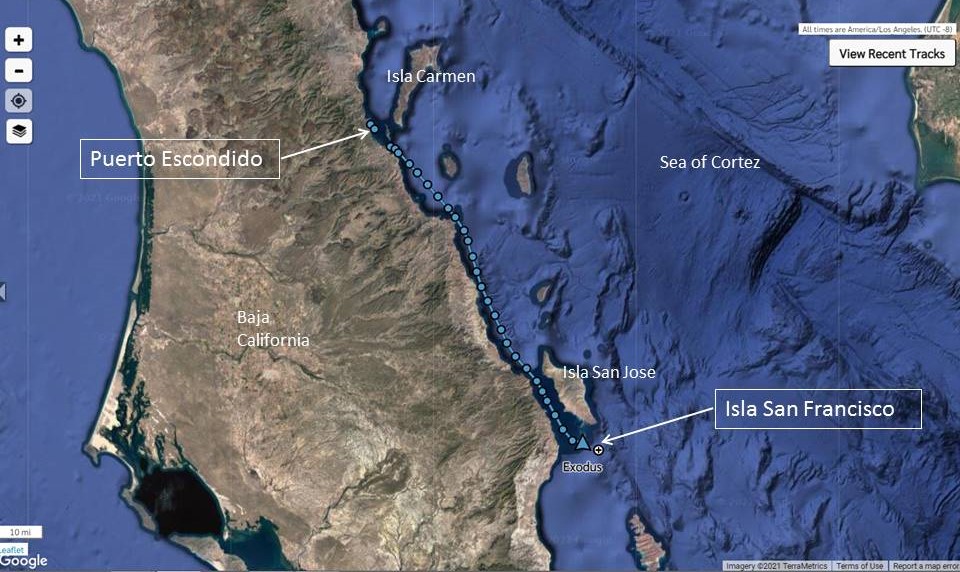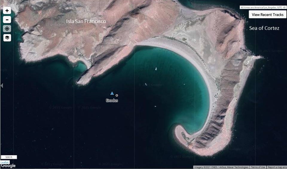 We left Puerto Escondido around 3:30pm yesterday and had a fast overnight sail to Isla San Francisco, arriving here before dawn, around 4am. Anchoring at night is not one of my favorite things, and the anchorage was crowded, which meant we had to pick a spot a little less protected than ideal. Tim and I both went to back to bed after anchoring, and woke up to a very rocky rolly Exodus. With daylight, we move into a little tighter formation with the other boats and we are now a little more comfortable.