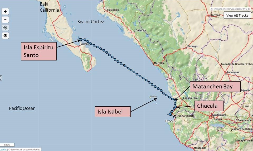 We were all pretty tired the first evening after being on passage for two nights, but the next day we got together and explored the island. We learned why Isla Isabel is called “The Galapagos of Mexico.” Frigate birds and blue footed boobies were everywhere! Talk about photo ops. I was wearing my running shoes with the bright blue coloring, so Carolina tried to get a photo of me with the boobies, but they wouldn’t quite let me get that close. The island is not that big, so we hike around just about all of it. It was an absolutely amazing place. We were fortunate to have good weather and be able to anchor there for a few days.