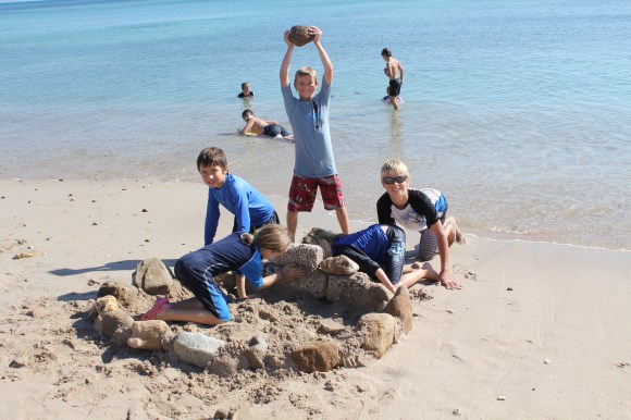 I’ve mentioned Punta de Mita a few times, so I thought I’d give a little more information about it. It is the northern point that defines Banderas Bay (Cabo Corrientes is the southern point), and the hook of land just inside the point has a small beach town. The anchorage is a popular spot amongst the cruisers for the surfing, and it is sort of a getaway spot when you feel like getting away from towns and crowds but still feel like staying within the Bay. Our first time there was actually by land when we took the bus from La Cruz. Shauna (s/v Sand Dollar) and I thought we’d take a our kids for a day outing for some boogie boarding and fun in the sand and sun. Of course, without consulting each other we both invited other kids to come along and when all was said and done it was me, Shauna, and 11 kids age 7 to 14. It was actually a lot of fun, but there was obsessive compulsive head counting going on when we were boarding and disembarking the buses. We parked ourselves on the sand in front of a palapa and ordered some drinks so we could sit there and let the kids play. The waves weren’t that great that day, so some of the older kids tried going to a few different spots, but it was pretty calm everywhere. That didn’t stop them from having fun and they played in the lapping surf and dug holes and built forts. We also stopped at the OXXO (convenience store, like 711) before grabbing the bus back, and they all got good and sugared up for their parents. Among the kids we took were Victoria and Jonathon from s/v Fuenta. Have I mentioned already how I would take those kids anywhere? Well, I would. They are fun, friendly, and very very low maintenance. Our second time at Punta de Mita was by way of Exodus when we anchored out for one night when Gary and Marsha were visiting. We found a spot close in where there was easy access to the surf, and this time there was surf to be found. Unfortunately, Alex had another ear infection, so he wasn’t able to play in the water, but Tim and Brenden took the boards out and had a lot of fun. A few of our friends (s/v’s Fluenta and Kenta Anae) had taken the bus up from La Cruz so they all did a little surfing together. Alex tried to get to shore to play with the kids, but the surf was too big for him to paddle in without the risk of falling in and getting his ear wet, so he had to abort the mission and turn back. Spoiler alert – we will spend more time at Punta de Mita in future installments, but for now these were our initiations to Punta de Mita.”