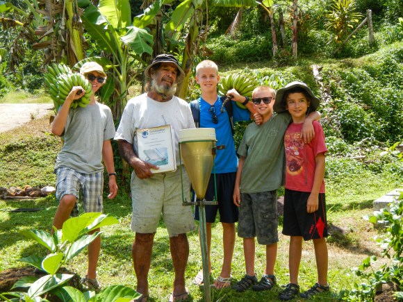 Tim, Steve, Carolina, and I also hiked over to an organic farm and picked our own green beans, lettuce, radishes, and eggplant, and we also got some tomatoes and peppers that were already picked. The owners of the farm were very friendly and gave us fresh coconuts to drink the water out of. They also let us try some of the various melons they had. The part of the hike back that was along a trail just off the beach was amazing and I regret I didn’t have my camera with me. White sand, blue water contrasted with dramatic black volcanic boulders. No, it wasn’t a quick trip to the store for veggies, but it was a journey worth taking. While we were at the farm the boys all hiked up to the top of the ridge the other direction towards the town in the next bay to collect mangoes. Would you believe they came back with 96 nice green mangoes? Our plan was to give or trade them to people in The Tuamotus, since we had heard they have far less access to fresh fruit than they do in The Marquesas.