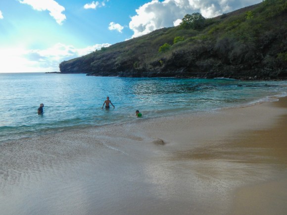 The next morning, we left a day ahead of our buddy boats and motored up the west side of Tahuata and did a drive by of the village of Vaitah, which has a nice, big anchorage where there were lots of boats. It’s supposedly a nice village, but it just didn’t draw us in, so we kept going north up to Hanamoenoa. This was a phenomenal anchorage with a beautiful white sand beach. We had a nice afternoon playing on the beach and a nice evening on board with just our family. I would say this was the perfect anchorage, except for two things. We didn’t think the holding in the anchorage was that great since it took us a few back downs to get the anchor to dig in, and, oh yeah, Alex got stung by a jellyfish, so that put a bit of a damper on things.