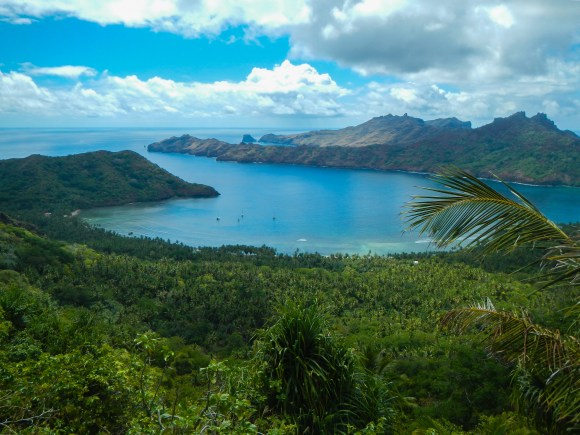We were pushing our stay in the Marquesas a bit long, but we still had one more bay to visit, Anaho, which the author of one of the guidebooks I used said was his favorite spot in all of the Marquesas. I could immediately see why, it’s one of the loveliest anchorages we had been in, well worth the bash to get here. Unfortunately, it rained quite a bit while we were there, so we didn’t quite get to fully enjoy it. On the 6 or so mile trip to get here from Hakaehu Lady Carolina landed a huge wahoo. We were on the radio with them, and Steve was telling us to go ahead and pull in our lines since we are set for fish for a while and then… whrrrrr…. fish on. Tim also wrestled aboard a 5.5 ft wahoo. So, then we were REALLY set for fish. We traded some with some locals for bananas, traded some to another boat for some dorado, and gave some away to another boat we’d seen several times previously at other anchorage. We had a HUGE wahoo dinner on Lady Carolina and another HUGE one on Exodus. Tim, Steve, Carolina, and I went on a hike (sans kids) up over a ridge to the next bay where there is a town and we heard you can get baguettes there. It was a long hike, and I enjoyed it because it gave me that same feeling I get from running (getting the heart rate a little bit up and then just pushing along). We scored some baguettes, but they were frozen and since it was such a small town, we tempered our desire to buy 8 each and cut it down to 4 each.