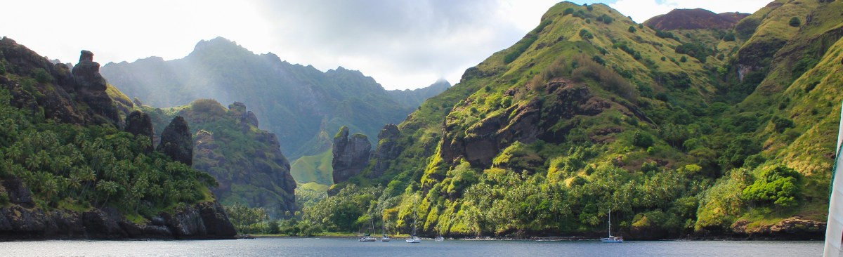 On 24 April we said good-bye to the southern Marquesas and headed for Nuku Hiva. We made the difficult decision of skipping Ua Huka, and we were going to leave Ua Pou as a game time decision, depending on how many anchorages we decided to go to on Nuku Hiva. Our first stop was Controller Bay in the SE corner of the island. It is a very large, deep bay with several lobes and different anchoring options. We were the first of our group to arrive, and we chose the main lobe off the village of Taipivai. Herman Mellville fans will note that this is the setting of his book Typee (which I keep trying to read but keep putting down in favor of some other tasty morsel.) It is a HUGE bay, and there was only one other boat when we arrived. We explored the town, hiked to another waterfall, and caught up with our old friends from Sara M and True Companion. Then we motor sailed just a bit west to the main bay, Baie de Taiohae, which also happens to be the administrative capital of The Marquesas. We spent 5 days in the very crowded anchorage getting all of our chores done and getting our wifi fix on before motor sailing just a few more miles west to Daniel’s Bay.