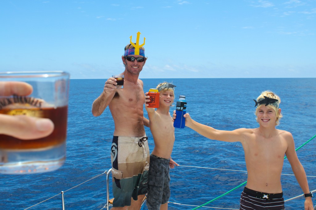 There are now four new shellbacks on board Exodus. We crossed the equator today! We hove-to just after crossing and had a ceremony to toast to Neptune. Then we all cut our hair and gave it to Neptune along with other gifts from each of us. The boys got buzz cuts. I passed on that, but Tim did cut it well above my shoulders. The conditions were very calm so the boys all went for a swim off the stern of the boat. We tied a line and let it trail just in case someone started drifting. We made pizza and cookies, and overall a great day was had by all. The wind is dead and we have about a knot and a half of current against us, so it’s slow going right now. According to the forecast we shouldn’t expect a whole lot of wind until we get down to about 5 deg south. Last night and tonight with winds in about the 5 kt range, we’ve elected to run one of the engines to charge the batteries rather than the generator, since we haven’t motored much we have more of margin on diesel at this point than gasoline (for the generator). And the extra knot or 2 of boat speed we get is nice too when we’re just slogging along.