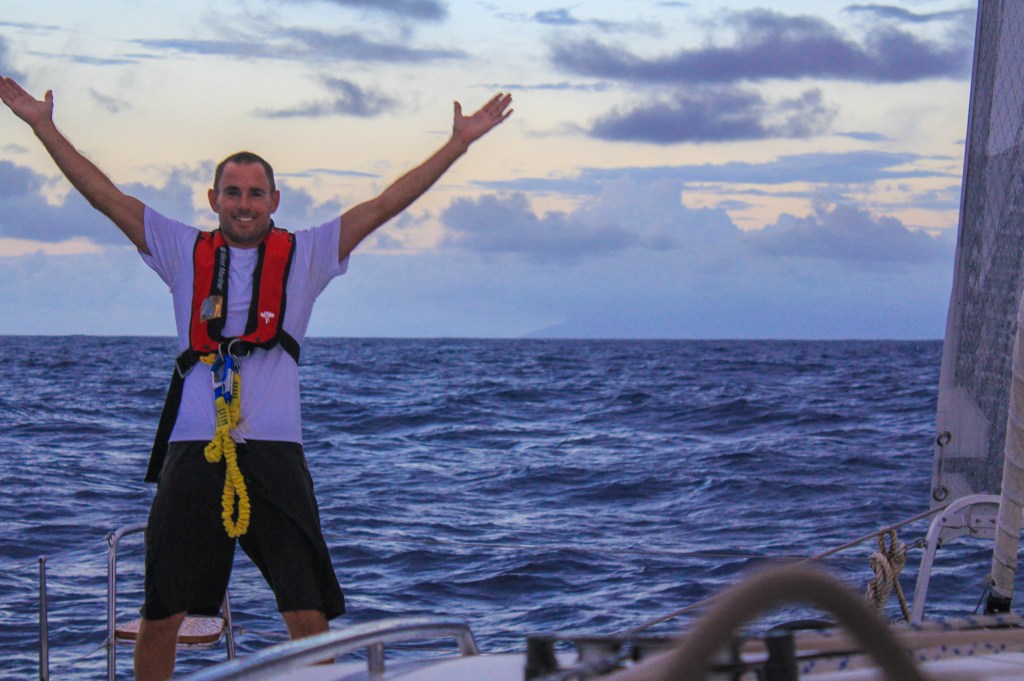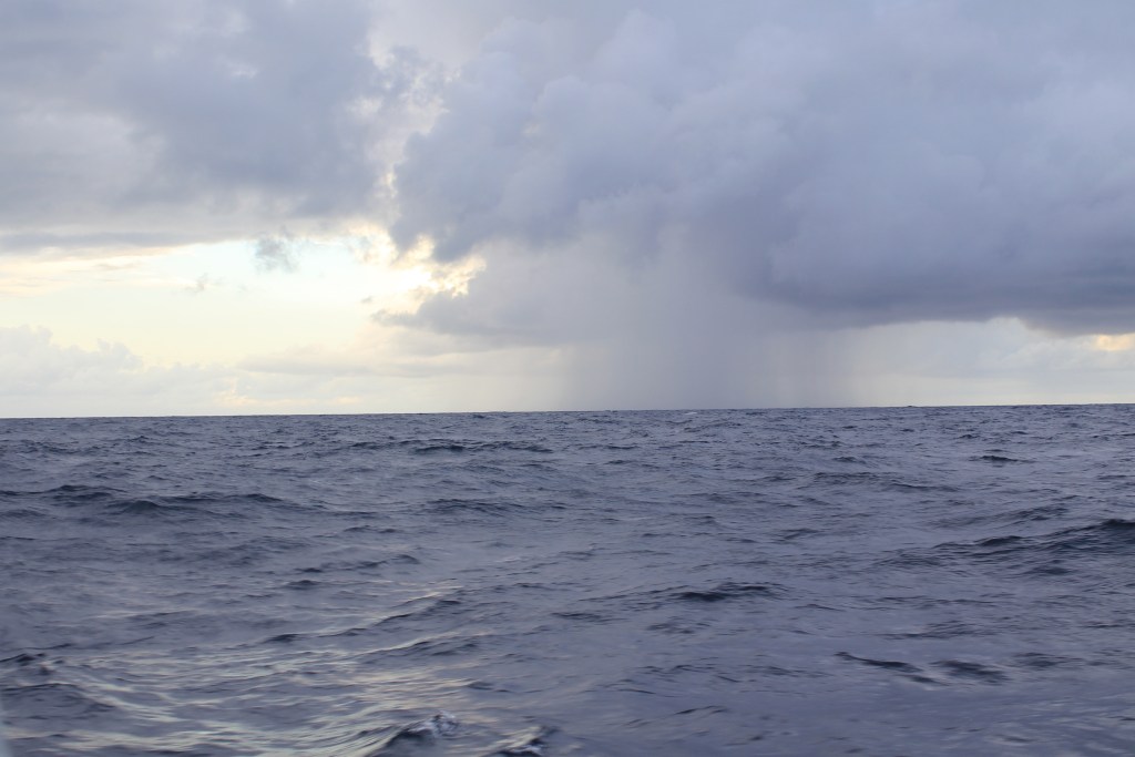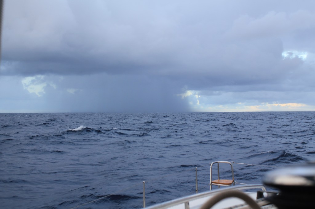 We had a hell of an arrival, though. We had a lot of squall activity through the night. On my first watch I was faced with a parade of squalls and was trying to run parallel to them, but the last one in the line nailed us and I saw heavy rain and a max of about 28 kts, with full canvas. Not ideal, but not terrible. On my second watch I was faced with another parade of squalls, this one longer and with bigger pink blobs (on radar), so even though Tim had asked me to wake him at sunrise, I still had to wake him early because I didn’t want to get nailed again. I reefed the head sail alone, but needed Tim to reef the main, so I got him up, and we reefed, and… the squalls dissipated. Of course.