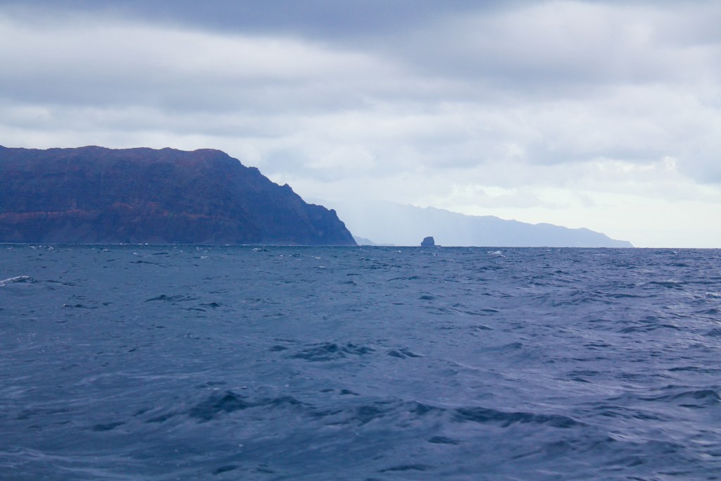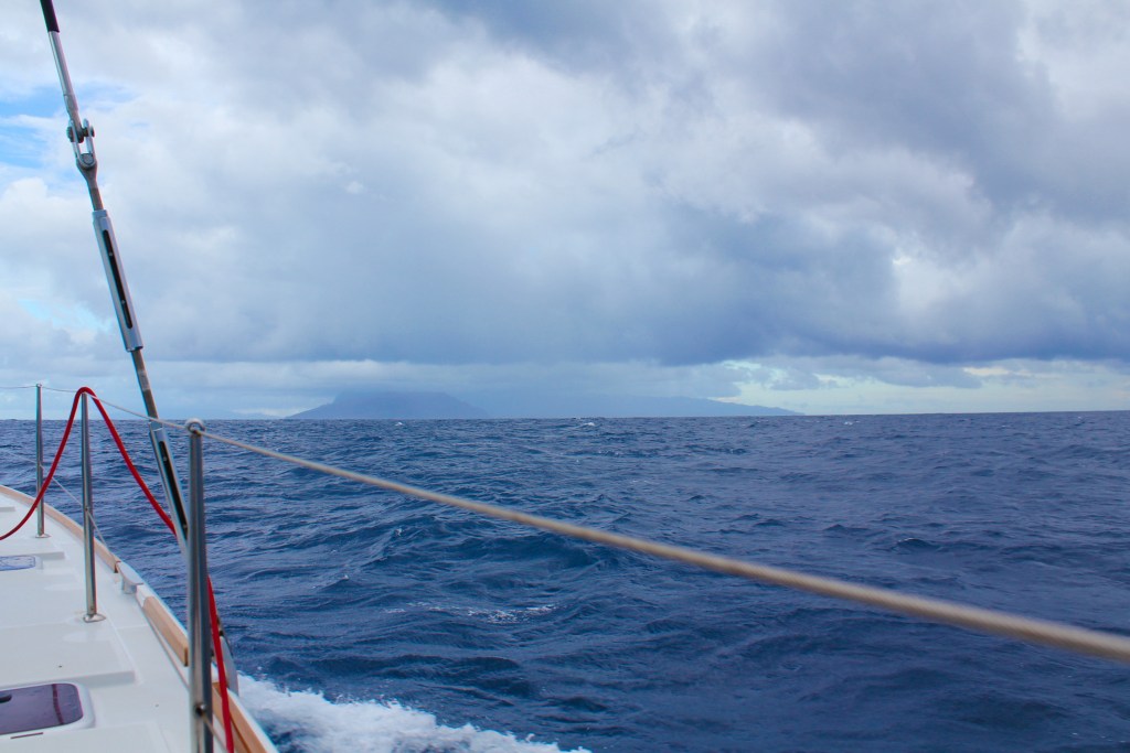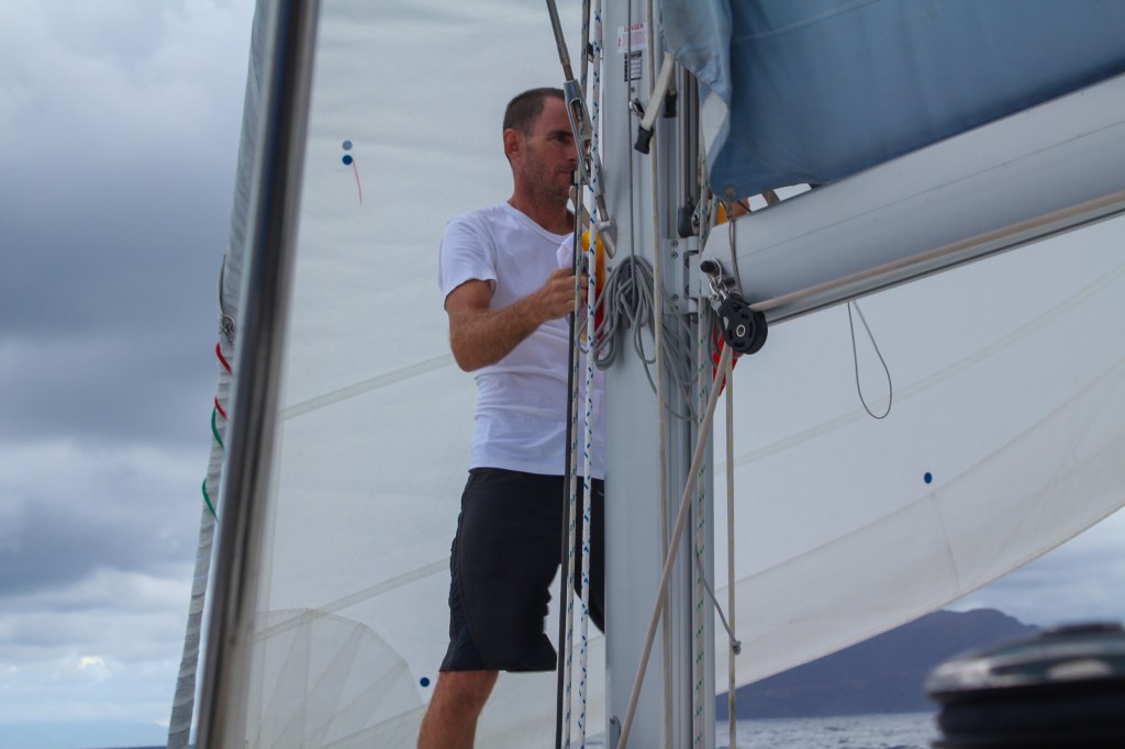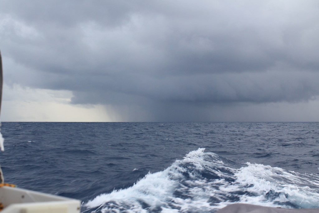 When we were close to the island, all the squalls on radar were behind us moving across our path, so we were clear and in the home stretch. I even turned the radar all the way off, not standby, off. When we reached the tip of the island the wind shifted suddenly and hard to the NE, which meant the squalls were now being blown right towards us. We got hit suddenly, and a little bit flat footed, with a doozy. We saw low 30s with full canvas before we put one reef in the main and 2 in the genoa. Then we got seriously nailed. Sustained 40 kts with gusts up to 47. (Sound familiar?) The second reef still wasn’t an option due to a fully chafed line, so we needed about a half a second to decide to just engine up and drop all sails. We were so close, we did NOT need this drama. Turning into the wind and dropping the main was a bit of a hobby horse ride, but we are a pretty well oiled machine at that maneuver by now, so it wasn’t too bad. However, we really weren’t prepared for that maneuver in terms of the mess all around the boat, and the boys were awesome at tending to the fishing pole that almost blew out, and the BBQ cover, and the dinghy painter that was trailing behind us (which would have been a disaster had it fouled an engine)