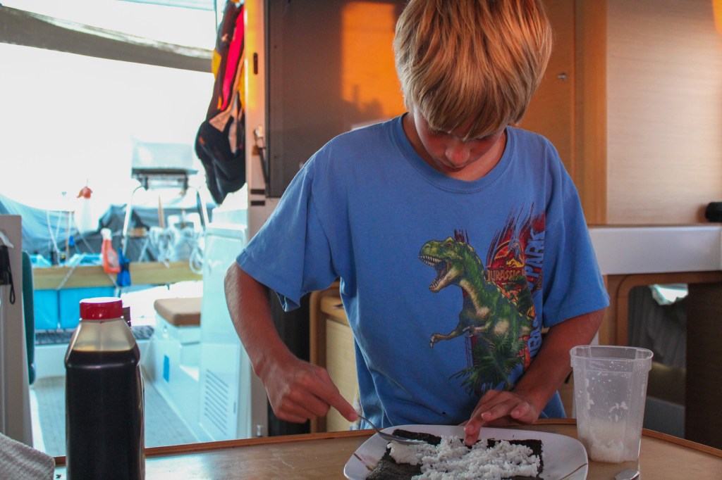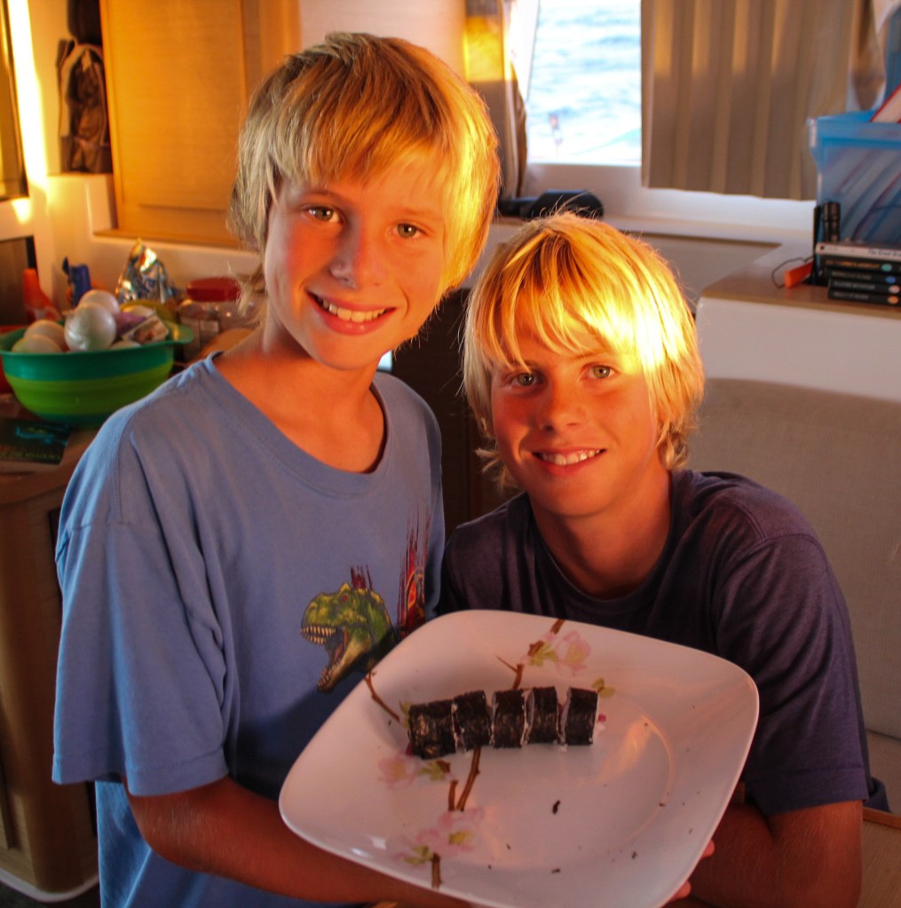 Tuna! Tuna! Tuna! Well, the yellow fin tuna that have eluded us all year long finally showed up today. The entire crew is ecstatic, and Brenden even did a shake your bootie dance. They are pretty small, but at this point we are happy with anything. Sushi rolls tonight and seared rare steaks tomorrow night. Not much else is going on, really. The boys started school today, but I took a nap instead of helping them, so we’ll see tomorrow what they actually did. This evening seemed like any other night at anchor, just a bit more rolly. Tim was filleting fish while I was cooking dinner. I had to take a moment and look around and remind myself we’re in the middle of the freakin Pacific Ocean!