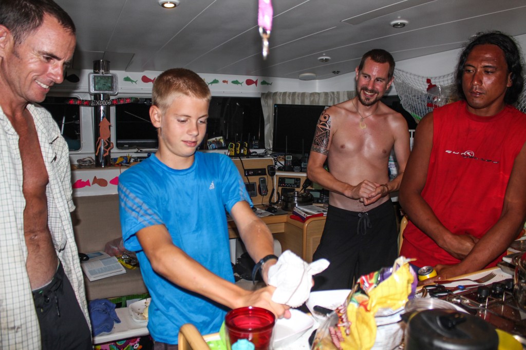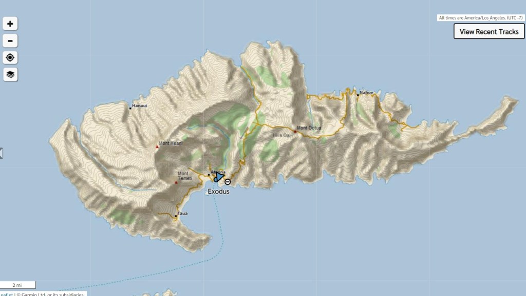 We are still in Atuona where we arrived last Wednesday. We have been having a great time welcoming the rest of the gang here… Lady Carolina and Chara arrived on Friday, and True Blue V will arrive later this morning. There is also another kid boat here with a 14-year-old boy and 12-year-old girl, so we also had them over yesterday evening. We will probably leave here tomorrow or Tuesday, depending on whether we can arrange for an island tour tomorrow. Today is Sunday, and the island pretty much shuts down. You can’t even get baguettes on Sunday!