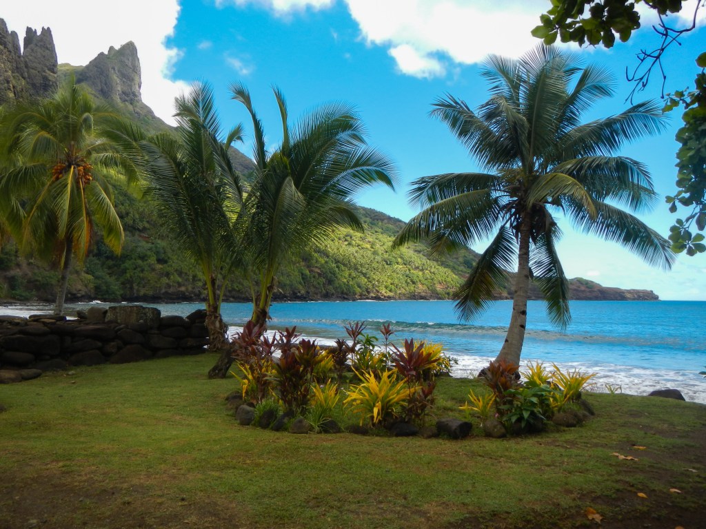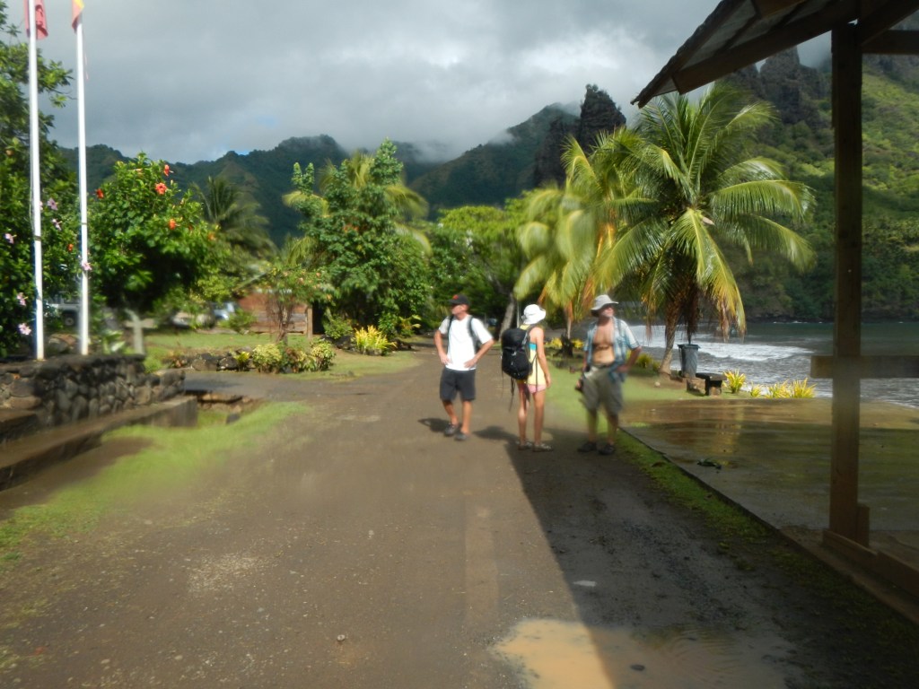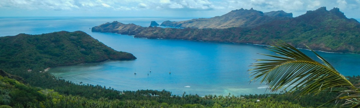 We are planning to leave Anaho around noon today (Marquesan time) for the Tuamotos. Our planned first stop is the atoll of Raroia, and we expect it to take between 3 and 4 days. We want to arrive on the lee side of the atoll where the pass is by Wed morning in order to make it through the pass at slack tide around 12:30. We’ll have the inReach on so you can track our progress and I’ll send another email if any plans change. Right now Tim is trying to find a leak in our dinghy and I just finished preparing passage food and I’m doing all the other pre-passage activies (testing EPIRB, getting sails ready, etc.) The boys changed the water maker filters and cleaned the sea water strainer and are currently trying to talk me into having the day off from school. They took yesterday off to go on a hike with Kyle and Joel to collect mangoes, and would you believe they came back with 92 nice green ones? We are trying to take extra fruit to the Tuamotus, because unlike the Marquesas it is not very abundant and we want to share with the locals. Tim, Steve, Carolina, and I hiked over to an organic farm yesterday and picked our own green beans, lettuce, radishes, and eggplant, and we also got some tomatoes and peppers that were already picked. The part of the hike back that was along a trail just off the beach was amazing and I regret I didn’t have my camera with me. White sand, blue water contrasted with dramatic black volcanic boulders. No, it wasn’t a quick trip to the store for veggies, but it was a journey worth taking.