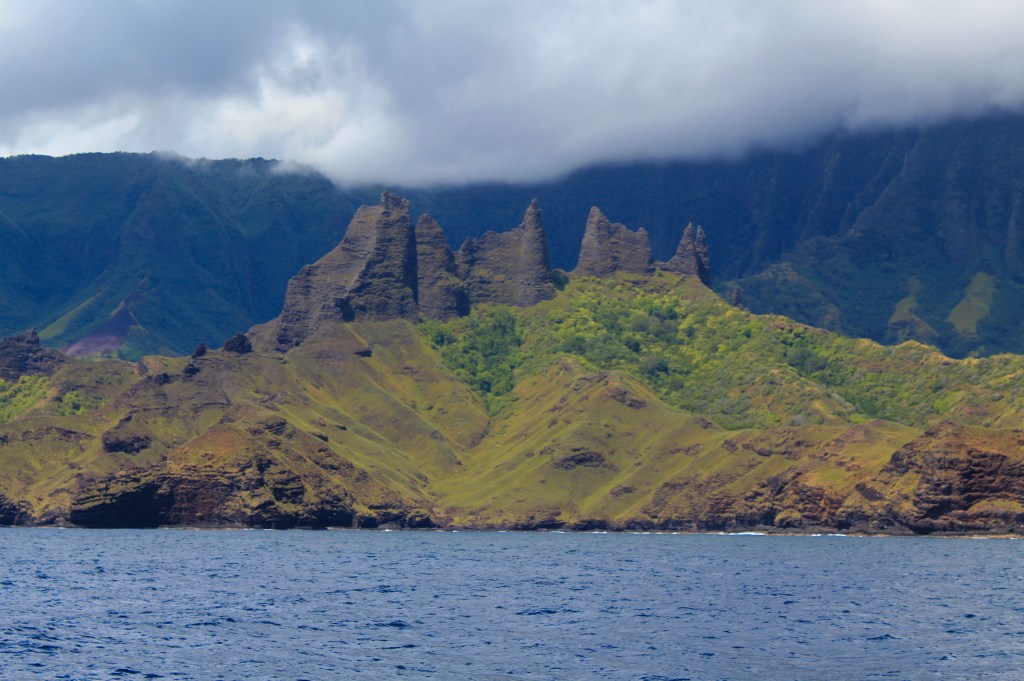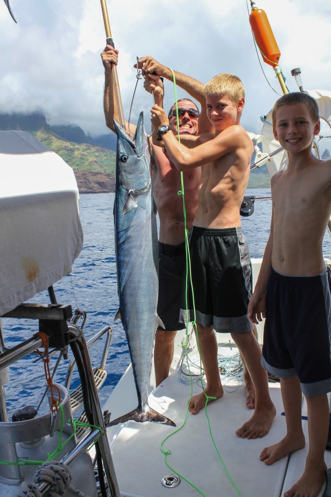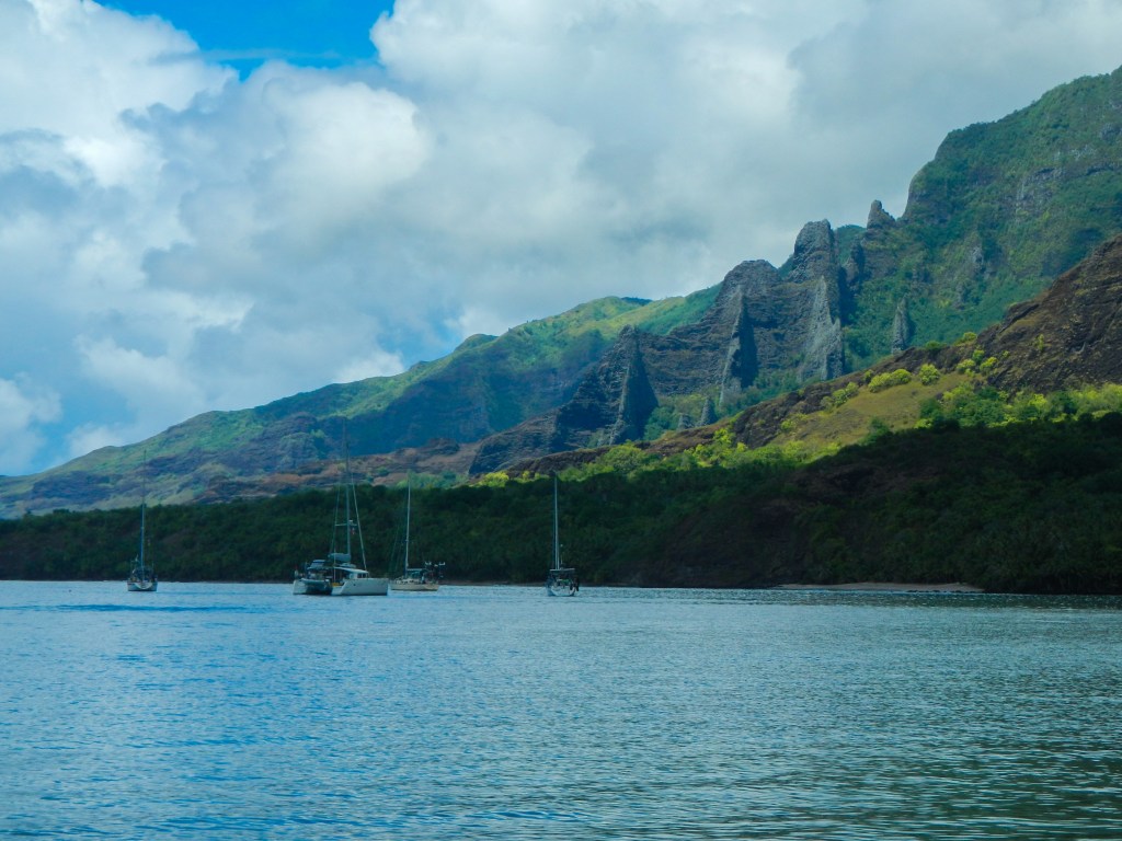 We made it to Anaho and it’s one of the loveliest anchorages we’ve been in, well worth the bash to get here. Unfortunately, it’s been raining all day today (Thursday) so we haven’t been able to fully enjoy it. We are down to just a day or two left in the Marquesas, so it’s a bit disappointing. On the 6 or so mile trip to get here from Hakaehu, Lady Carolina landed a huge wahoo. We were on the radio with them, and Steve was telling us to go ahead and pull in our lines since we are set for fish for a while and then… whrrrrr…. fish on! Tim also wrestled aboard a 5.5 ft wahoo. So, now we are REALLY set for fish. We have traded some with some locals for bananas (although the bananas have not arrived yet), traded some to another boat for some dorado, and given some away to another boat we’ve seen several times previously at other anchorage. We had a HUGE wahoo dinner on Lady Carolina last night, and we’ll be having another on Exodus tonight.