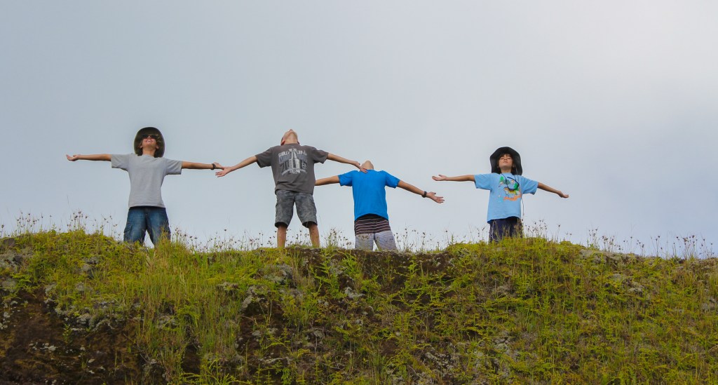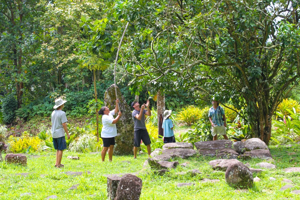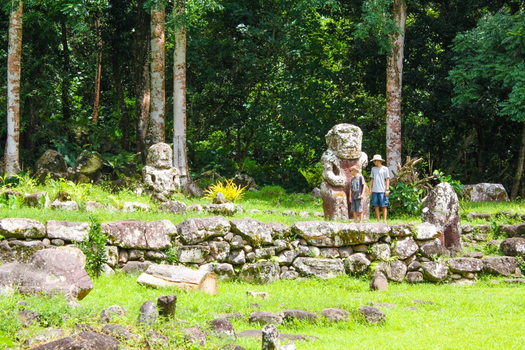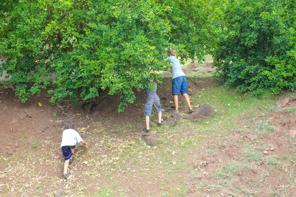 After a few hours we came to the primary destination of Puamau, a village situated on Baie Puamau, which is a large anchorage facing the northeast. Marie Jo drove us right up to one of the most amazing archaeological sites with several terraces and many, many Tikis. The guidebook says that one of the Tikis, Takaii, is the largest in the world standing 8 ft tall, but we didn’t know it at the time. We had fun observing all of the Tikis, but in the end our attention came to be focused on a large pamplemousse tree, and Marie Joe got a large stick and was knocking them down while Tim caught them. The boys explored a bit and found another pamplemousse tree, and engaged in their own fruit retrieval effort, successfully, I might add.