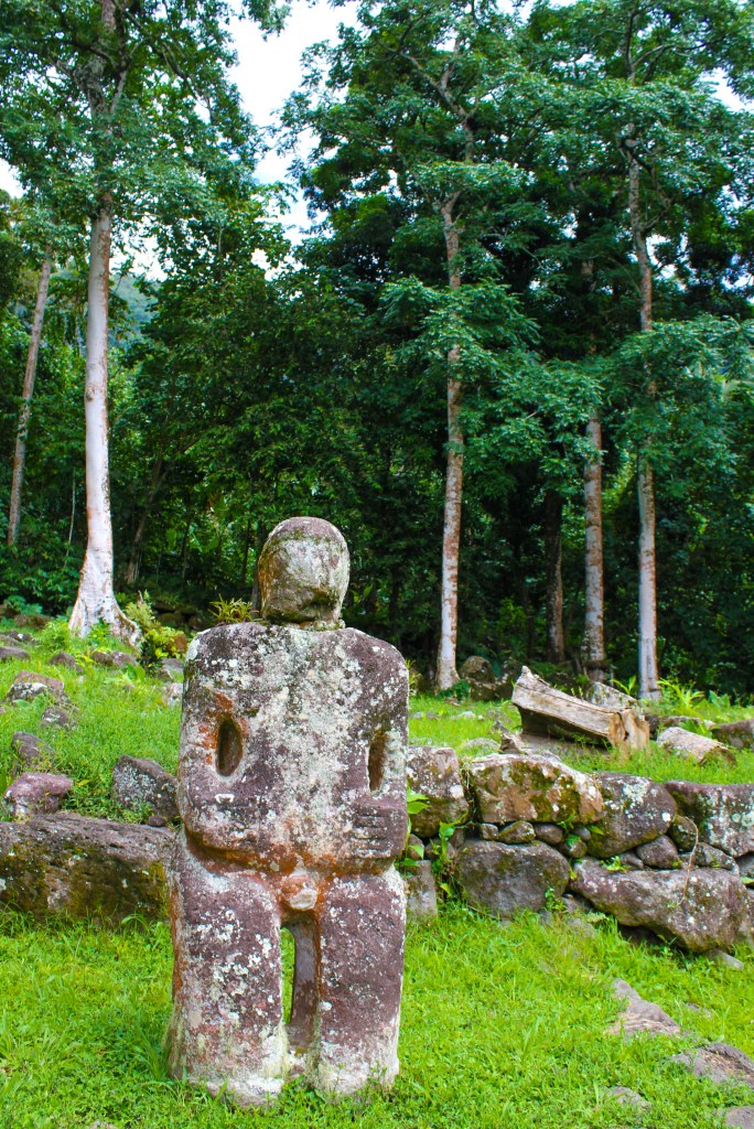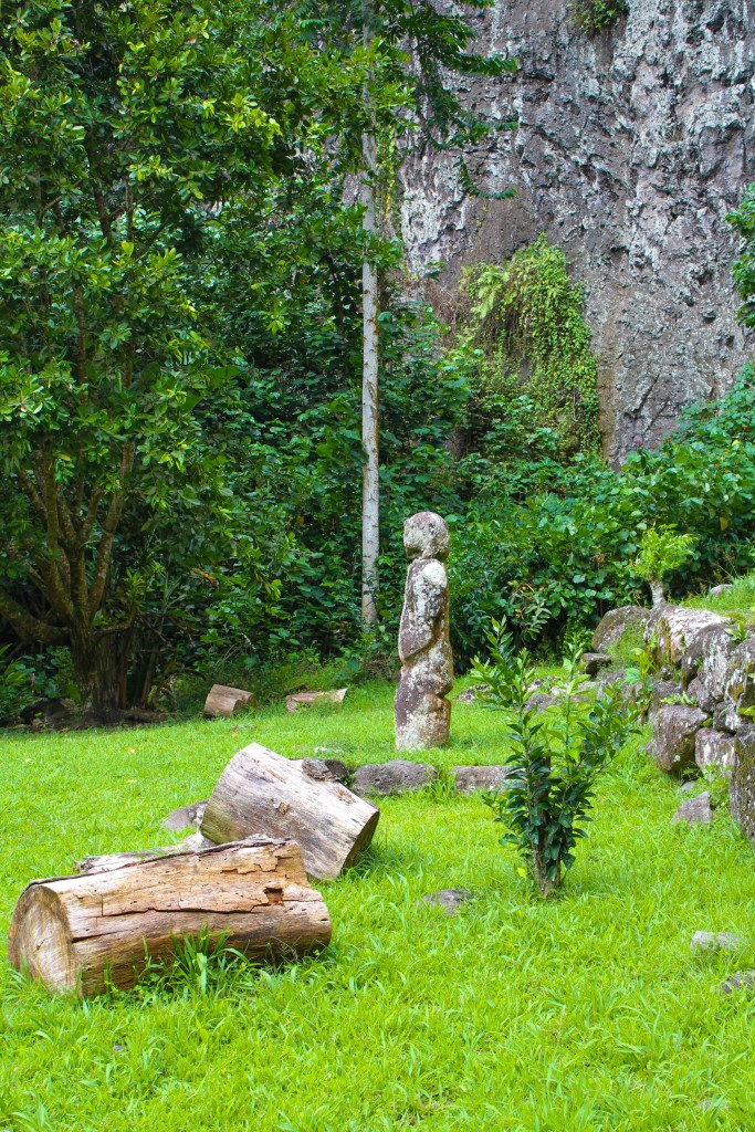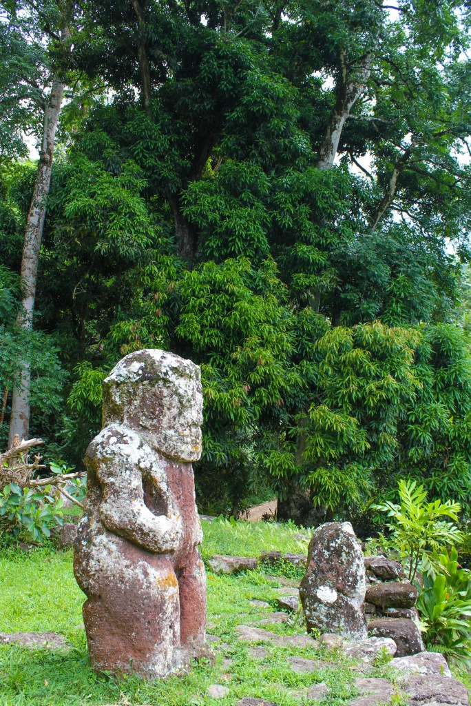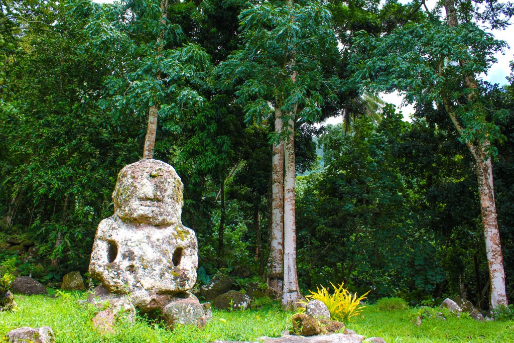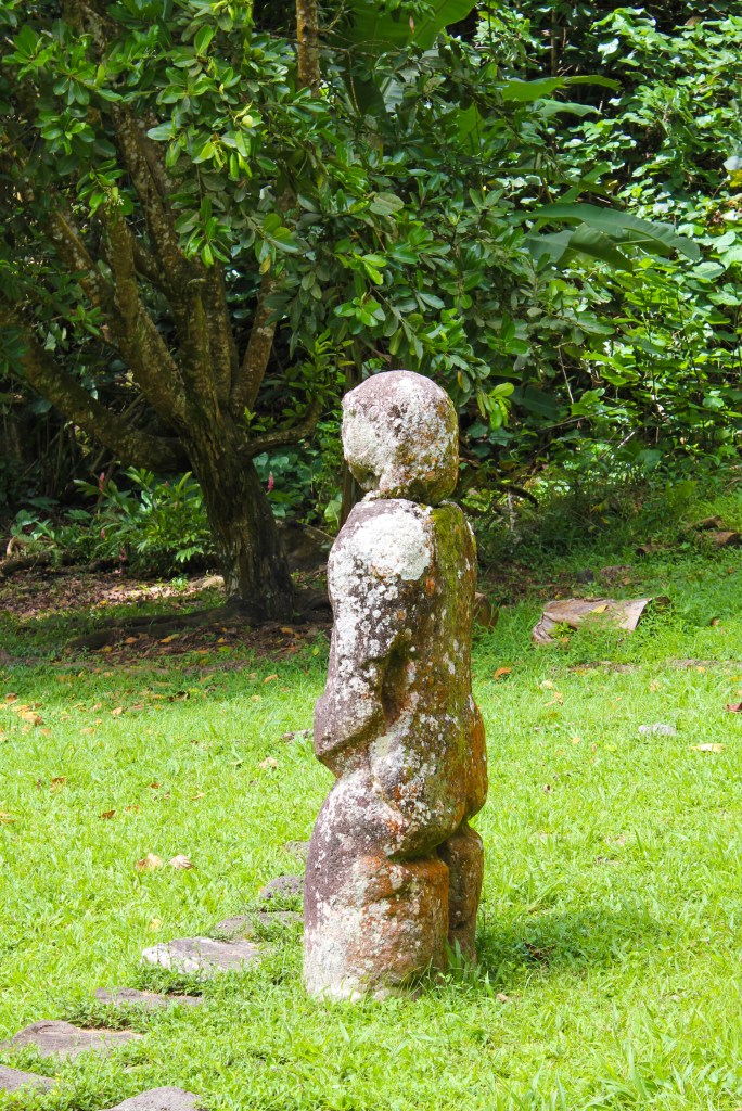 We made better time on the way back because we made fewer stops, but we did stop somewhat close to Atuona, to take a look at the smiling Tiki. It was a short trek into the “jungle” and it really was a smiling tiki. It was small, only coming up to about mid-thigh, and it had a rounded head, making it look like the minions in the movie Despicable Me. We took all the obligatory photos and then proceeded to gather all the tiny chili peppers we could find.