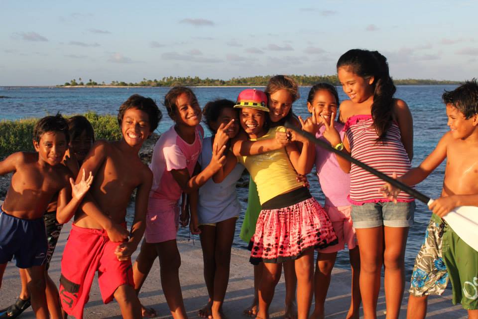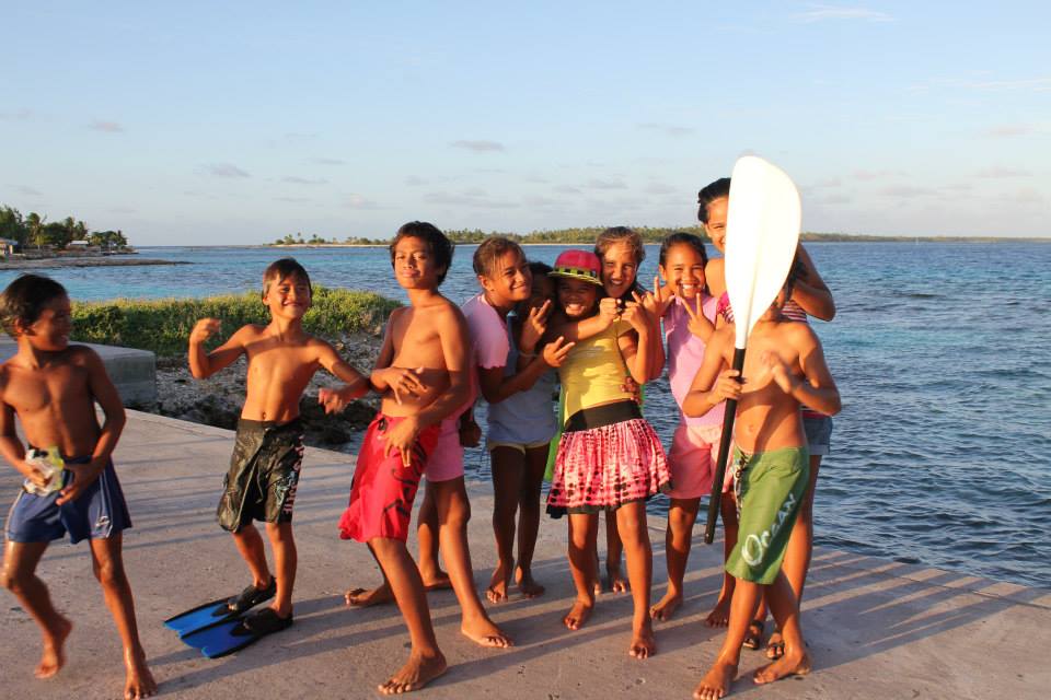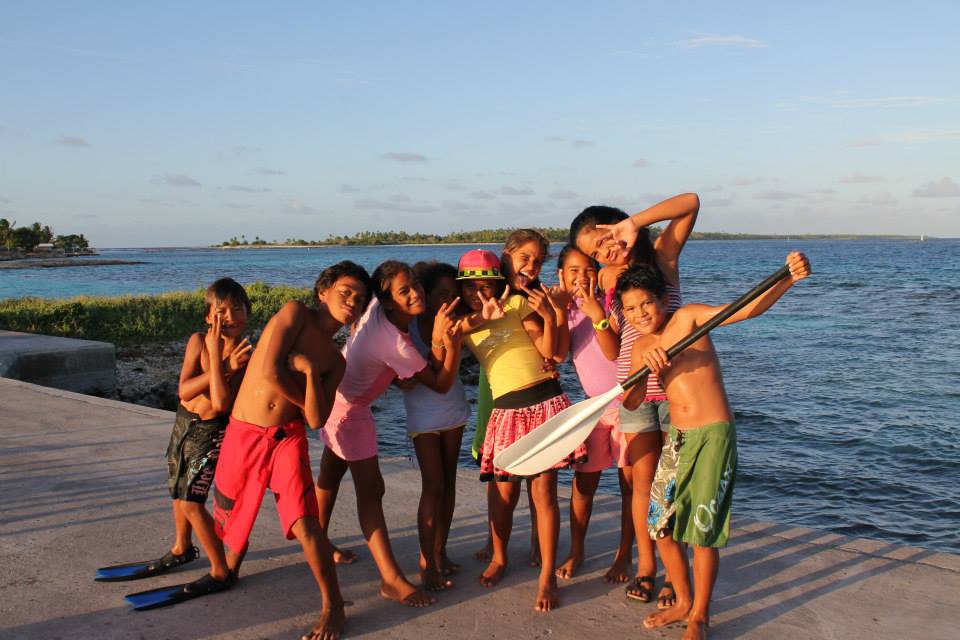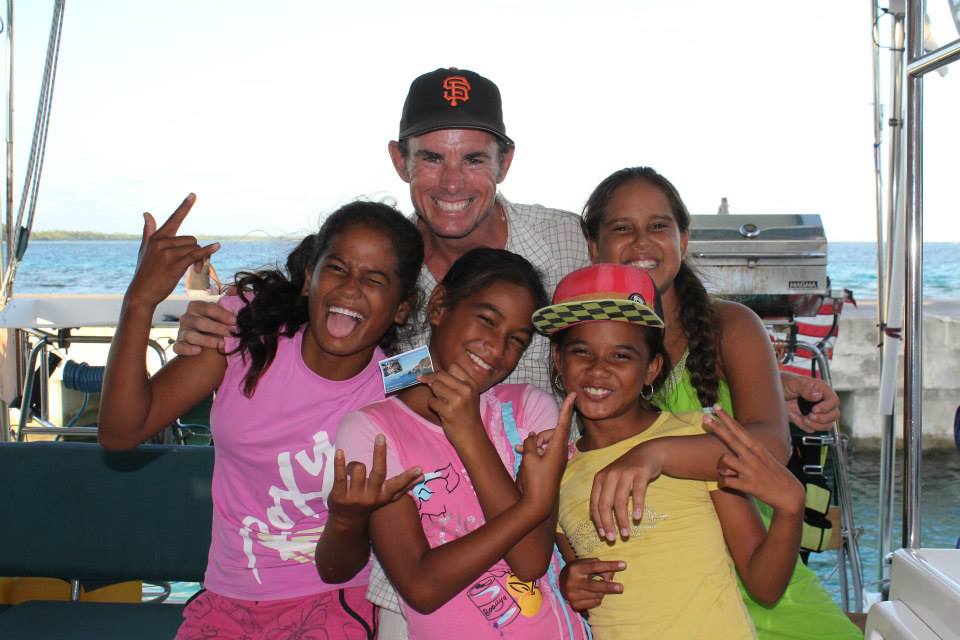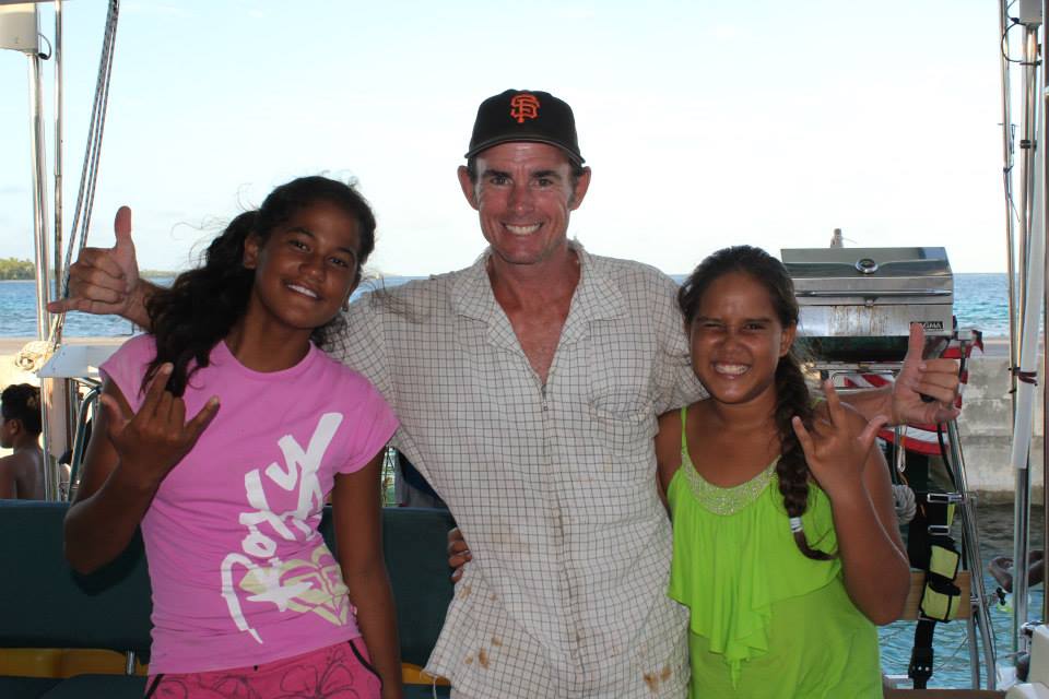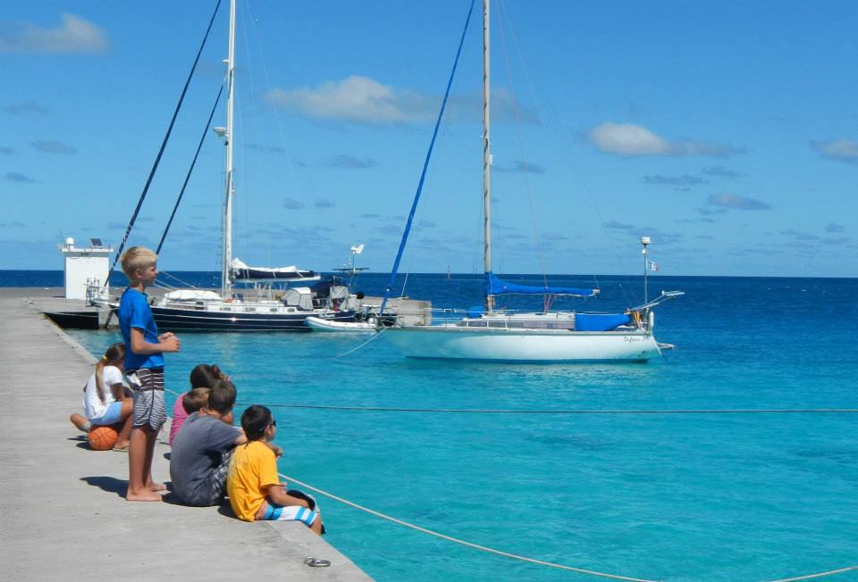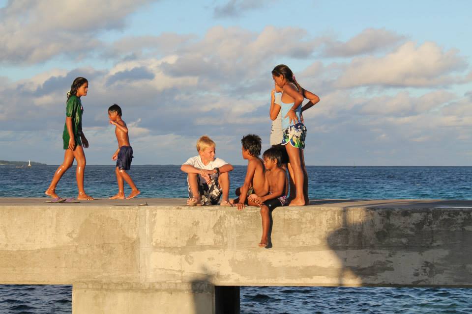 We had a great first day here in Makemo, but the highlight had to be that Exodus and the dock around Exodus have become the hangout for all the local kids. They swam, played with our American football (Tim would throw it and they would try to catch it as they jumped off the dock), played with our surf boards and paddle boards, and we all tried our very best to communicate with what very little French we know. They even took the boys to play a game of soccer, and when they got back Brenden commented on how good they all were. Alex and Kyle are getting a lot of attention from the girls, of course, but they act like they don’t even notice. When we got up this morning there were a group of younger kids on the dock with flowers wanting to “change” them for chocolate. We will probably stay tied up here a couple more days so we can enjoy the baguettes and the kids, and then we will go explore more of the atoll.
