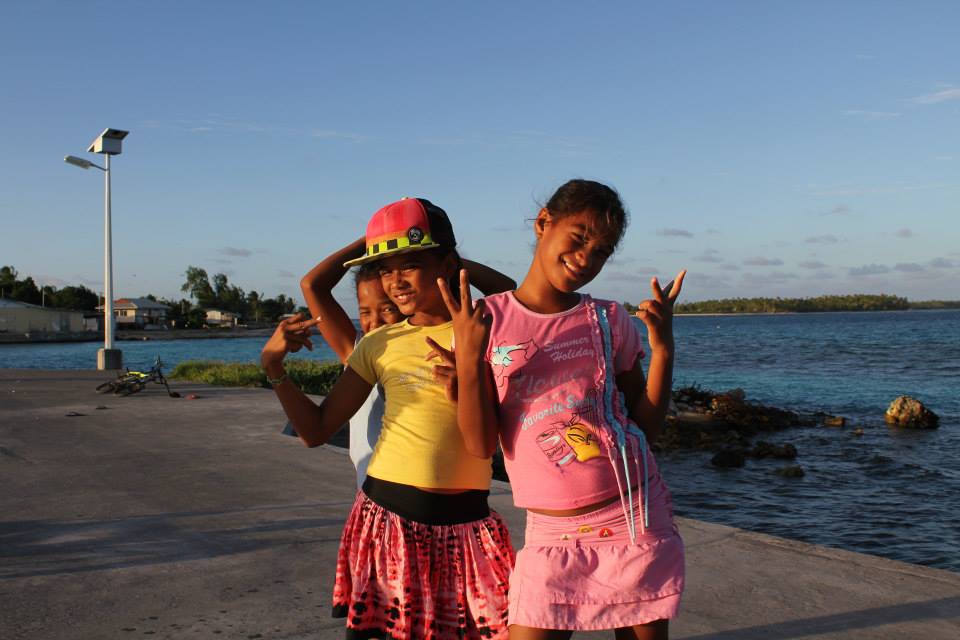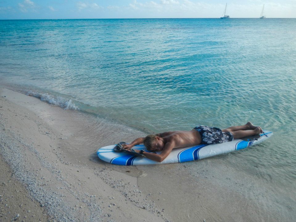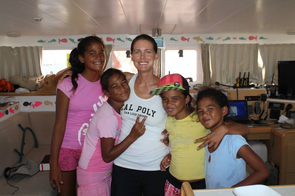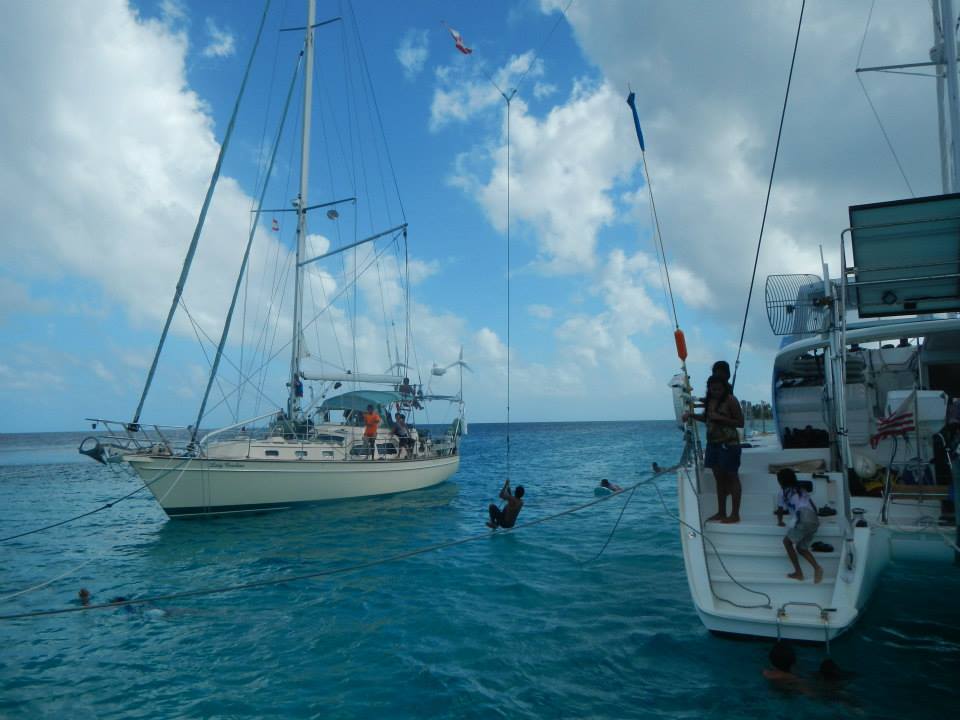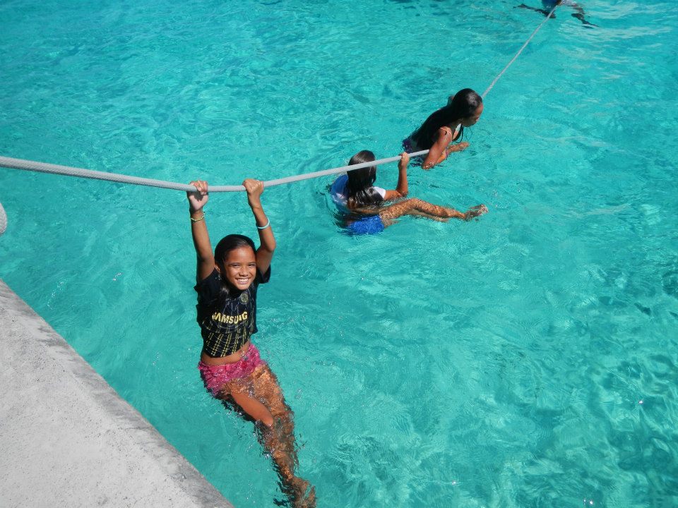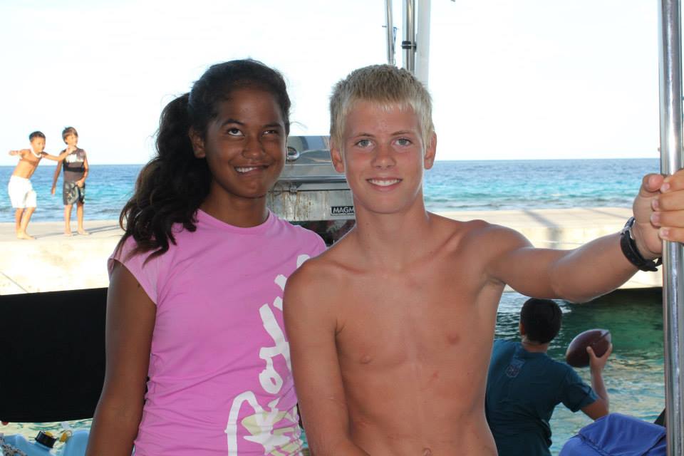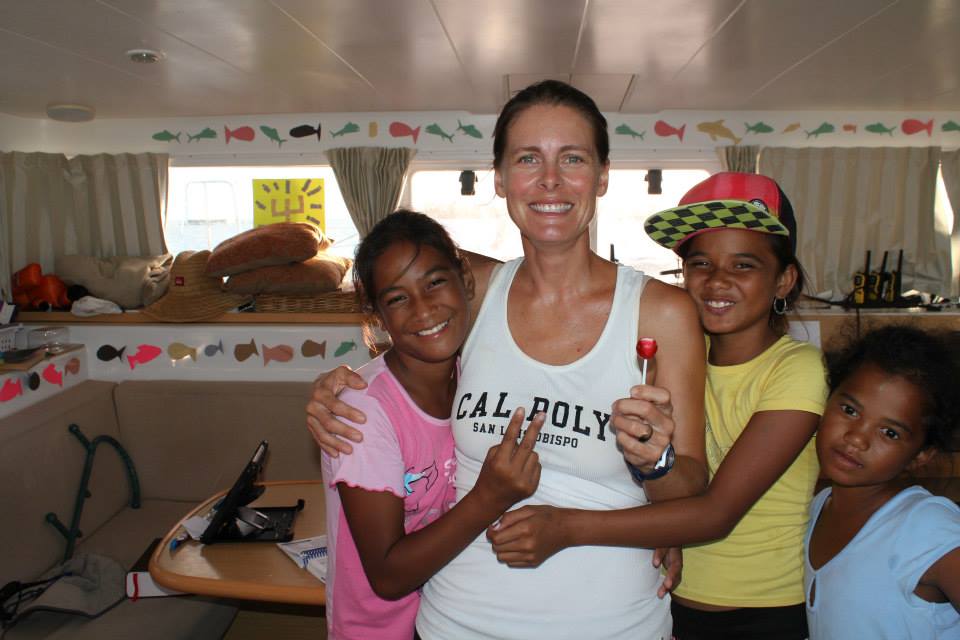 We had a great first day here in Makemo, but the highlight had to be that Exodus and the dock around Exodus have become the hangout for all the local kids. They swam, played with our American football (Tim would throw it and they would try to catch it as they jumped off the dock), played with our surf boards and paddle boards, and we all tried our very best to communicate with what very little French we know. They even took the boys to play a game of soccer, and when they got back Brenden commented on how good they all were. Alex and Kyle are getting a lot of attention from the girls, of course, but they act like they don’t even notice. When we got up this morning there were a group of younger kids on the dock with flowers wanting to “change” them for chocolate. We will probably stay tied up here a couple more days so we can enjoy the baguettes and the kids, and then we will go explore more of the atoll.