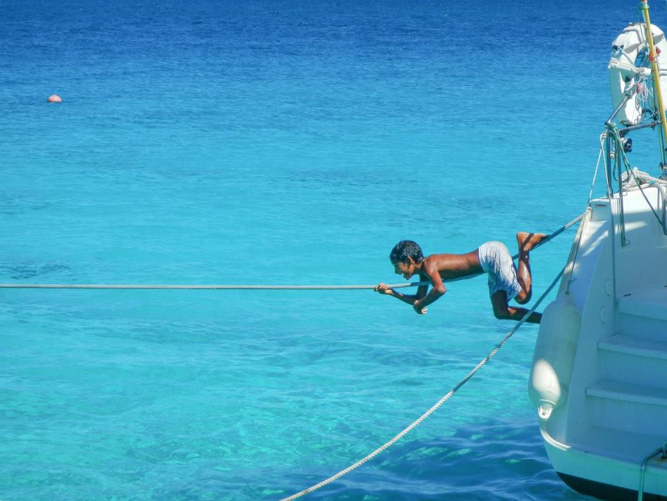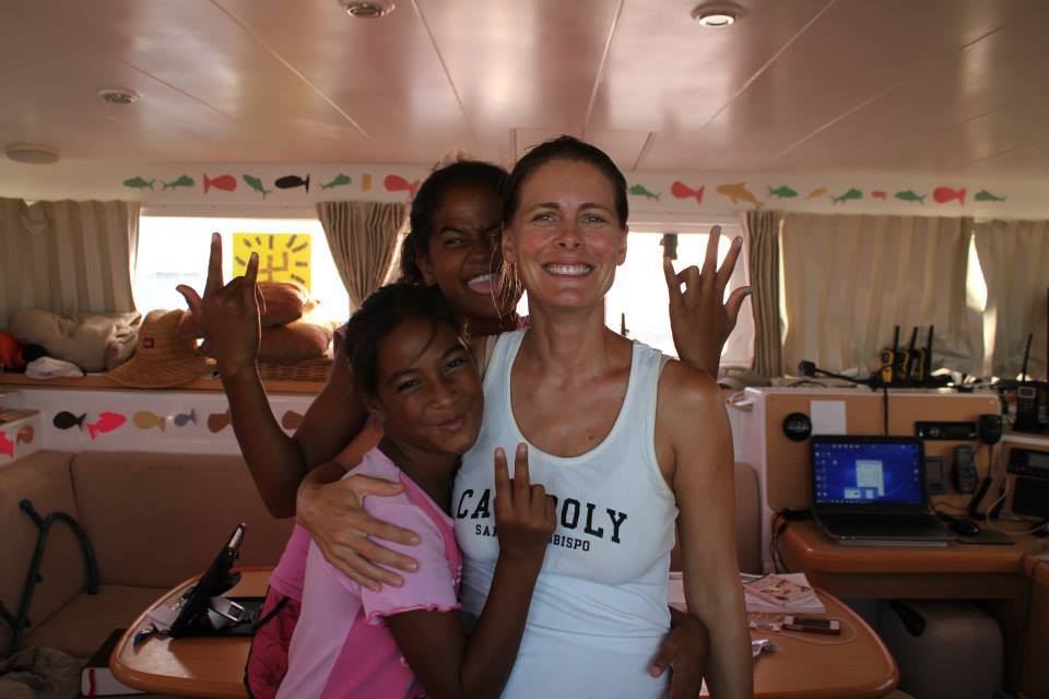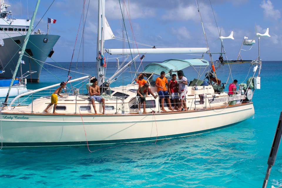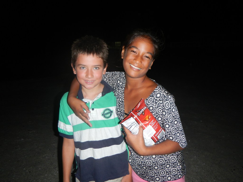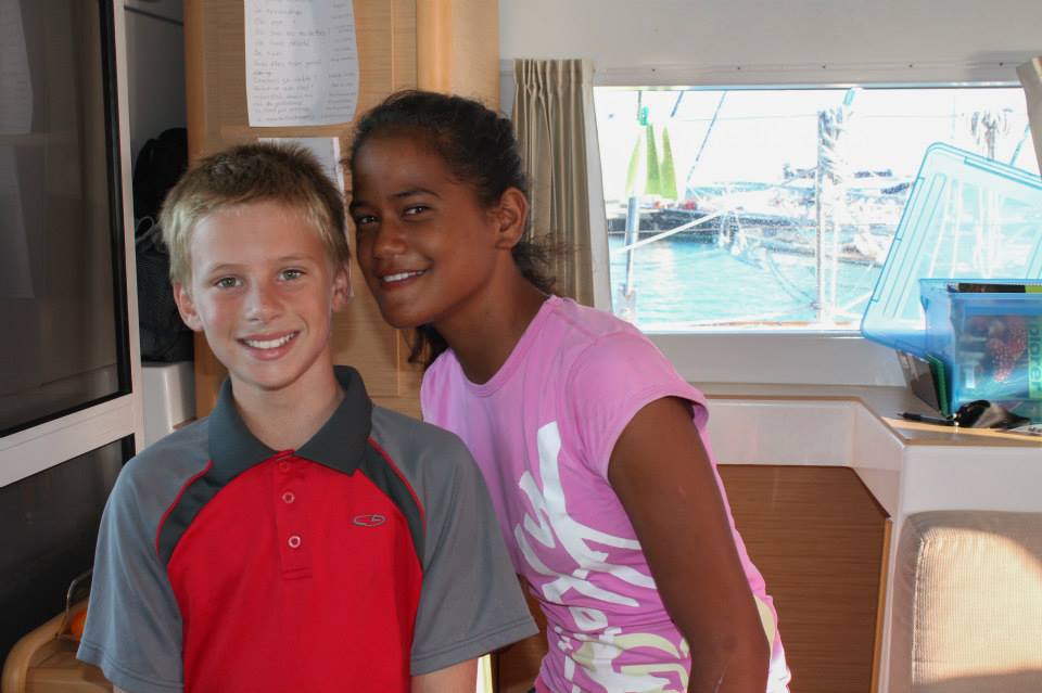 So, we ended up staying one more day tied to the wharf at the village, and I’m so glad we did. When I told the local kids we were staying “a demain” (until tomorrow) they were so excited they hugged me, especially the girls who are “in love” with Alex, Brenden, Kyle, and Joel. It’s funny, they communicate this by making a heart shape with their hands. They wrote notes with lots of hearts on them and gave the boys silly band bracelets. They spent the day with me on Exodus helping me chop vegetables and teaching me French. One of the girls would say a phrase in French and then tell me, “repetez.” They told me, in French, that they wanted souvenirs from us because they don’t want to forget us. I told them OK I understood thinking I would think of some things and give them later. Apparently what I actually did was give them permission to go to Alex and Brenden’s rooms and pick out what they want. They each came out with two shirts, dirty and smelly I might add, but they didn’t seem to care. I felt so bad I had to stop them because since they’ve been growing the boys don’t actually have that many clothes, especially Alex. Oh, they pleaded with me to let them have shirts, so I dug around in Brenden’s cubby and found some (clean) older, smaller shirts and gave them each one. Another funny thing is when Brenden came back he asked if I cleaned his room. I guess the girls thought the legos needed to be tidied up a bit! The next day Carolina was able to dig out a shirt of Kyle’s and gave that to one of the girls too, they were so ecstatic.