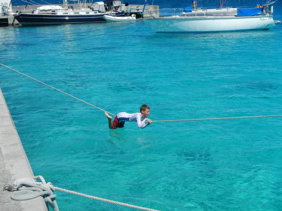 - Walk to town – 8 baguettes! Met lots of children – invited them to dock. Lots of playing, swimming, football, paddle boards. Kids all go play soccer