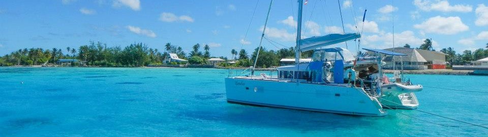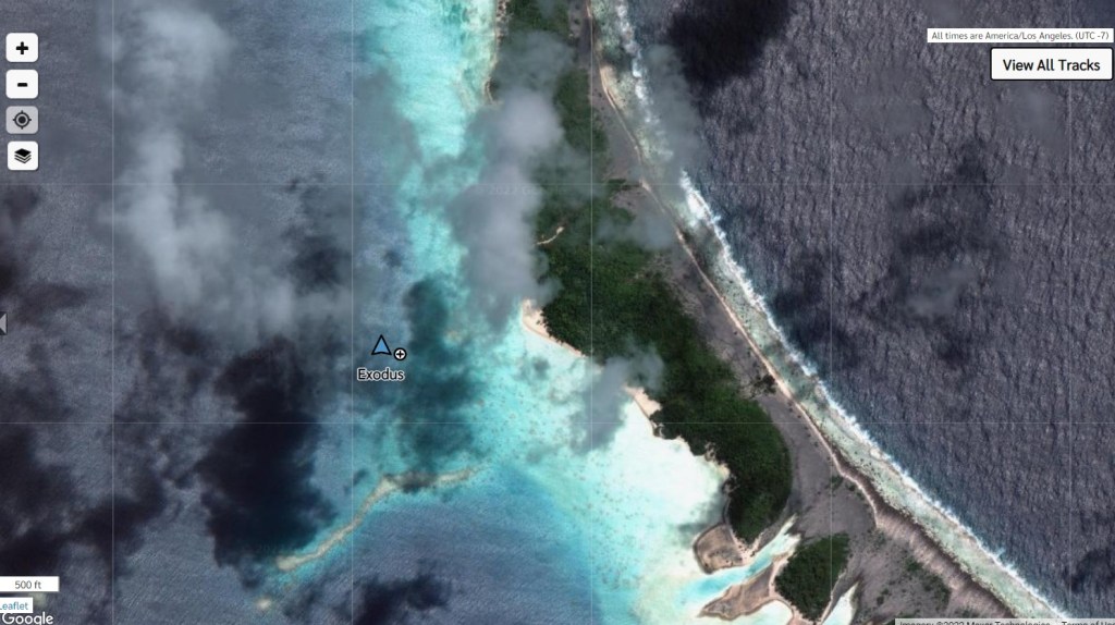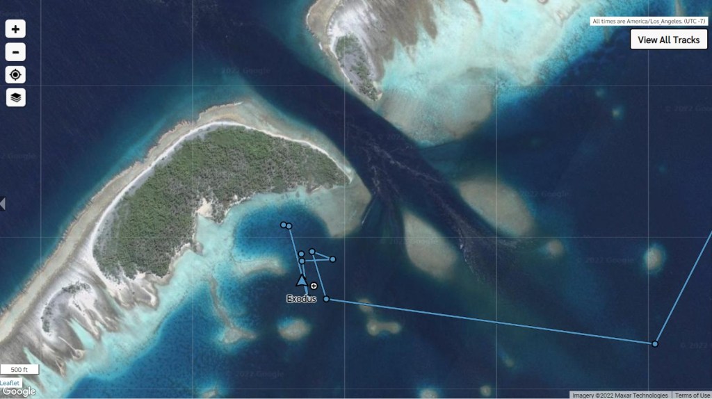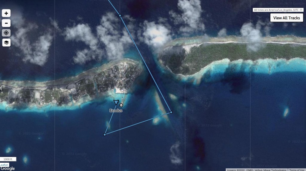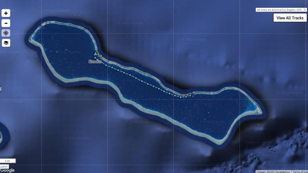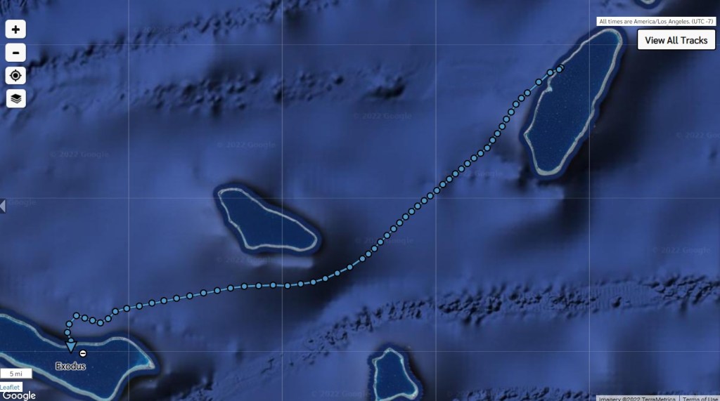 When leaving the dock we had a little bit of drama… we had bow anchor down and were stern tied to the wharf and good fortune had it such that the wind was blowing dead astern, so theoretically it would be an easy departure. Throw off the dock lines (we had help on the dock for that) and then just get pushed by the wind over the anchor as we raise it. No problem, right? Well, Alex wasn’t being quite as careful as he should have been and he jammed the anchor bridal hook up against the bow roller and the windlass fuse blew. I’m at the helm, and Tim tells me we have to raise the anchor manually, so “just hold us right here.” Well, some might think that with two engines holding Exodus in precisely one spot would be easy. And it is, in very light wind conditions. But with huge windage and very little keel, once the wind is over about 8 kts we get pushed around pretty good. And this day it was blowing 15-20. So, I try my best but we do end up getting blown sideways a bit, so my great idea is to just turn, drive back to line we were on, and then face the anchor again. In the process of doing that, I wrapped the chain around a coral head. What a fiasco, Tim had to jump in the water to free the chain, and at this point I just turned us around to face the wind so once free of the coral head we just floated back bow to the wind and raised the anchor manually (with help from Steve who had jumped in the water and boarded Exodus) in a more normal wind orientation for anchor raising. So, I was ready for my rum right there, but we still had 3 hours of navigating through the coral heads to the next anchorage. I dipped into the Zaya for that safe arrival cocktail! It’s a nice spot, but not as nice as where we anchored in Raroia as we are much further from the beach without as much wind protection.