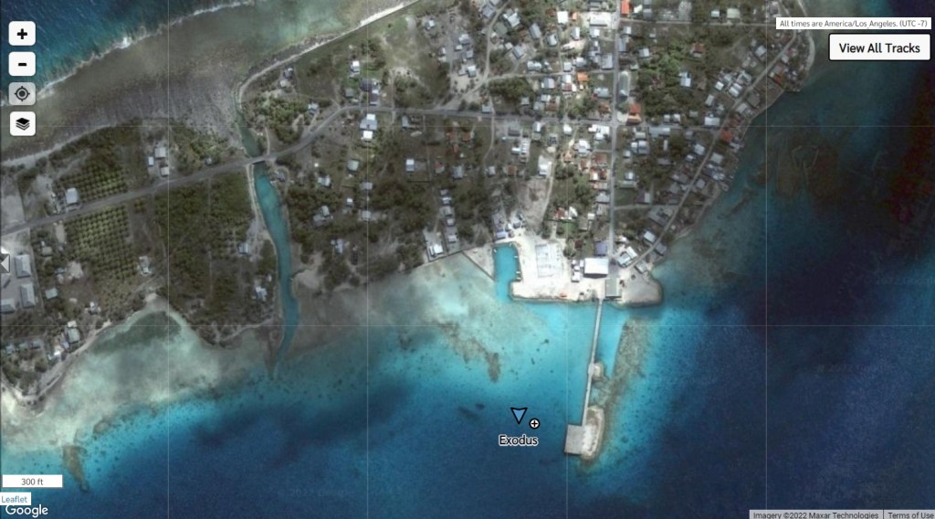 We just arrived at our second atoll in The Tuamotus, Makemo. It is larger and has a more substantial village than Raroia, so we are looking forward to getting ashore and doing some exploring. Exiting the pass at Raroia was easy, the overnight passage was easy, entering the pass here at Makemo was easy (incoming tide, max 3 kt current), but tying up at the wharf was a bit challenging. This was our first time with this maneuver… we dropped the bow anchor and then backed into the wharf and tossed dock lines ashore to some guys who came to help us. The problem is that Exodus is so big and fat and has so much windage we were getting pushed sideways pretty good. With Alex’s help, we got everything secure and now I’m going to download weather to see if we want to stay here tonight or move to a protected anchorage. We are going to try to get some school work done before going in search of baguettes.