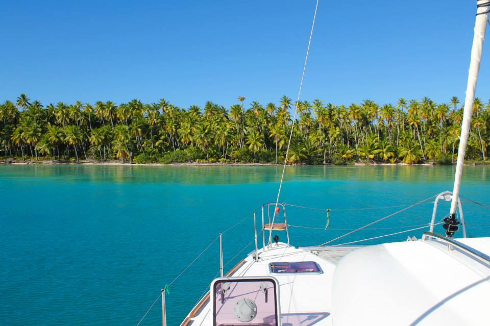 We had picked out an anchorage from the Soggy Paws Compendium, and when we arrived, it was jaw droppingly brilliant. It was out of a postcard or a professional photograph, not a place that you actually get to visit in real life. There was a white sandy beach, palm trees swaying, and crystal-clear turquoise water that beckoned you for a swim. We were totally protected from the ocean swell bashing against the other side of the reef, and the low lying motu and palms also provided protection from the wind, so the closer you got to shore, the glassier and clearer the water was. And there was absolutely no one else there. Certainly not in this anchorage, and since no one was on AIS and no one answered our VHF call, it’s possible we were the only cruising boat in the entire lagoon. It was amazing. We were sitting in a stereotypical remote tropical paradise with a slight breeze and water lapping on the swim step. The weather was a bit cooler than The Marquesas, having dropped so many degrees in latitude. Tim and I spent the evening on the net (Exodus foredeck) after sundown, and I was actually a bit chilled, a sensation I hadn’t experience since way back in San Felipe in October. The solitude lasted only one night, but that’s OK, we were joined by the rest of our “clan” Lady Carolina, True Blue V, and Eleutheria. We had a potluck on Exodus the first night after everyone arrived, and all the guys went stumbling around the motu hunting coconut crabs. Steve from Lady Carolina did a write up on this, which a must read and follows down below.