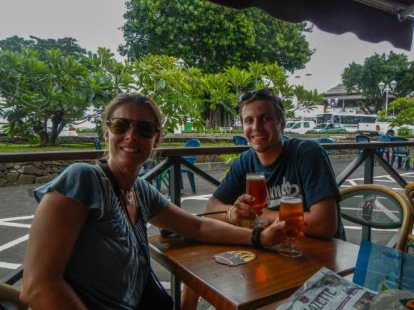 Our day in Papeete was a pleasant one, and Andrew’s first (and only) objective was to get a gift for his girlfriend.  We walked around the shops upstairs at the Gran Marche mostly looking at jewelry, and more specifically, mostly looking at black pearls.  I was in the market for a sarong myself, as they are so versatile.  Is it a wrap, a skirt, a dress?  Why yes, all three.  I picked one out, and right away Andrew said he really liked it and he wanted to get one for Jamie.  Of course it was the only one of the style, and he gave me puppy dog eyes (like Brenden gives him) and I relented.  Fine.  Give it to Jamie.  She better like it.  🙂  We also found some nice black pearl earrings for her, but I’m afraid I’m not much of a haggler, so I’m not sure we got the best deal.  With gifts purchased, it was time to find the beer.