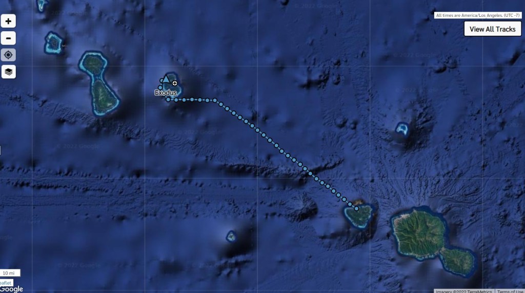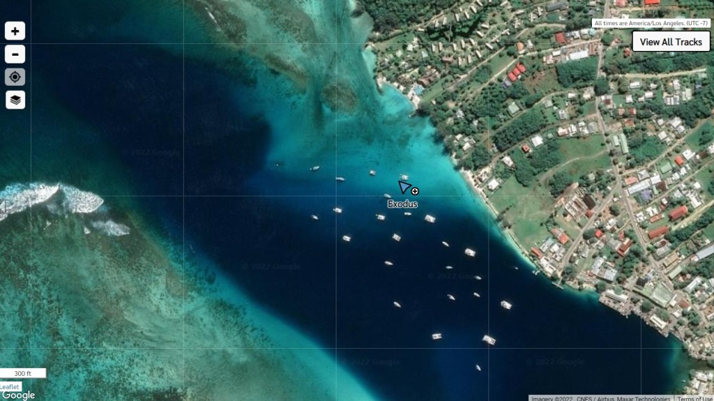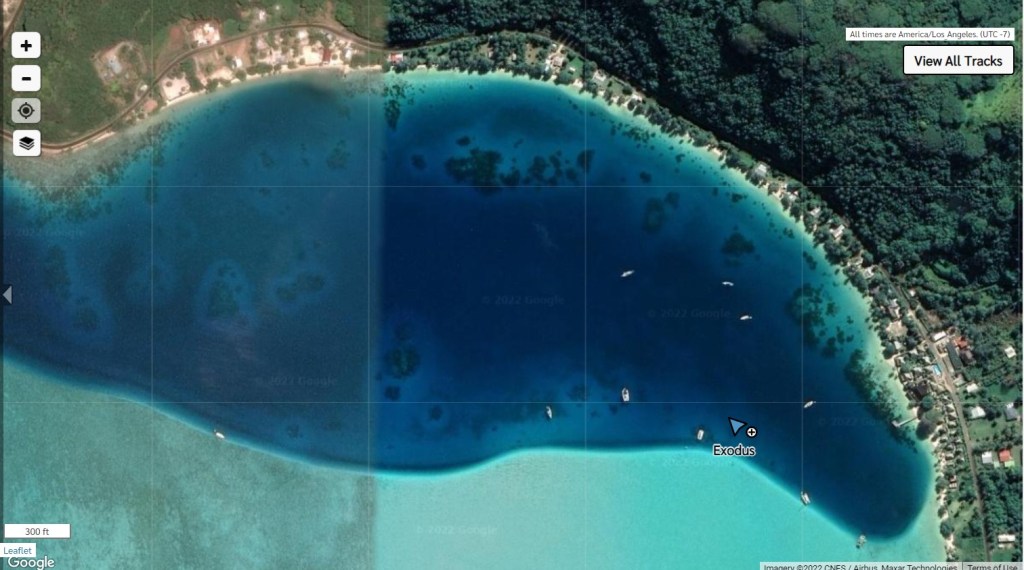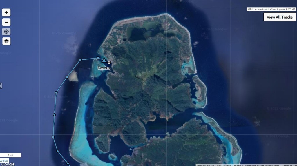 We pulled up anchor just after dark yesterday to head from Moorea to Huahine. We used our GPS track when we entered the pass to help us get out, but it was about as easy as a night departure can be. We are currently about 10 miles from the island but then we are going to head around to the West side to anchorages over there. I just changed course and jibed so that we would have sun on the solar panel, so we are now going to head around the south end of Huahine rather than the north. Of course, now there’s a big fat cloud sitting over the sun, so it’s mostly for naught. I had a little excitement on my watch last night in that we were sandwiched between two large cargo ships going in opposite directions. They each passed within 2-2.5 miles of us, so I was really enjoying the AIS receiver right about then.