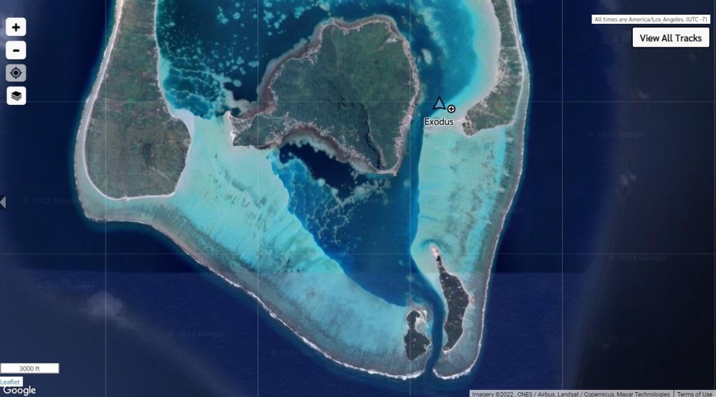 We dropped anchor near the village in Maupiti yesterday just after noon. It’s a refreshingly quiet place after the noise of Bora Bora. Noticeably absent are the numerous power boats speeding past you jostling you with their wakes. There are only 2 other sailboats here at anchor with them, and one of them is another Lagoon 400. So, yesterday afternoon as Alex and I were finishing up school, Tim and Brenden went over to say hi. They are a couple from France and this is their second time cruising the South Pacific and their second time at Maupiti, so they were able to give us the lay of the land. We think we are going to go for a hike today, but Tim seems to be getting sick (sore throat) so we’ll have to see how he feels when he gets up. The pass to get in was pretty easy after all the hype about how tricky it could be. There were probably 1.5 meter breaking waves against the reef, but nothing breaking at the pass entrance. A panga (they don’t call them those here, but Mexico is hard to shake…) came out of the pass and we were able to observe that the waves just inside the entrance were pretty small, and when they came out they waved us in and gave us the thumbs up. We had about 2.5 knots of current against us going in, but nothing Exodus can’t handle. The channel inside the lagoon leading to the town was pretty narrow, but very well marked, so it was no problem either.