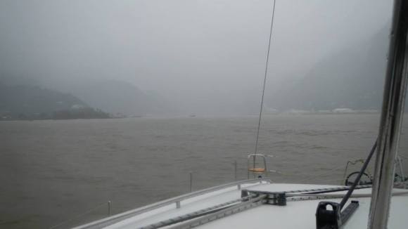We finally got wind again the following morning (July 29th). It was pleasant sailing for a brief time, but then conditions deteriorated, and we got seriously slammed on our final approach. After motoring for a day we were so happy to get wind again, but sometimes you have to be careful what you wish for. By the time we passed by the east tip of the island we had 25-30 kts of wind, 4-5 meter seas (the biggest we’ve seen since our San Felipe passage), pouring down rain, and fog. And to top it off we had a 2+ kt current pushing us north making it hard to round the island. We still had to use the engines in order to point at our destination! We were close enough that we had VHF ratio contact with Lady Carolina, which made those last few hours a little more tolerable. It was seriously uncomfortable and we couldn’t get there quick enough, but it was never scary.