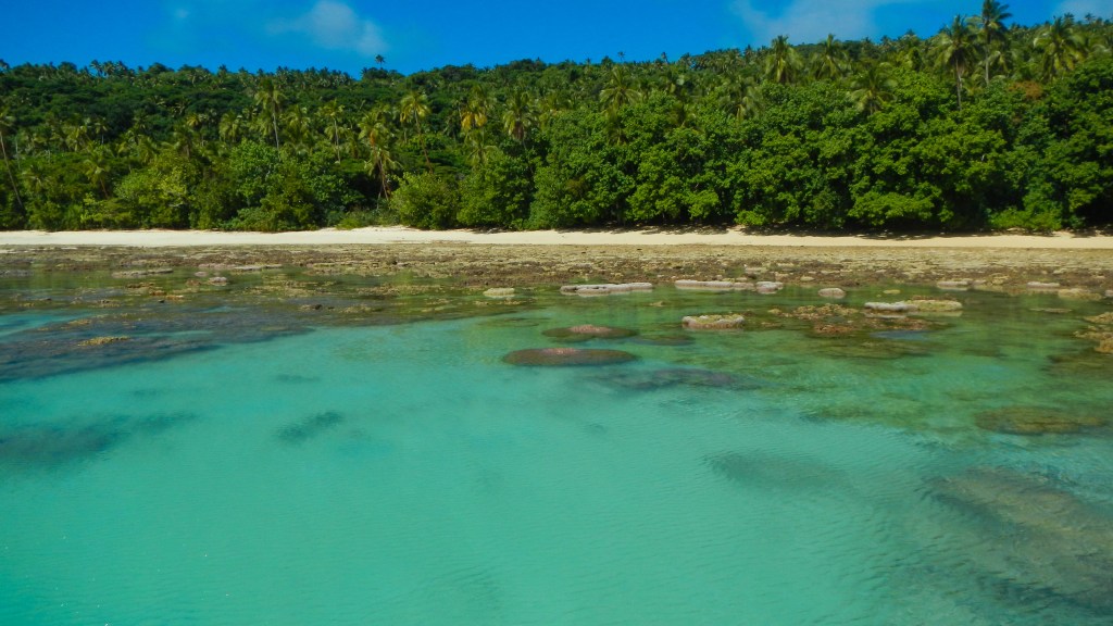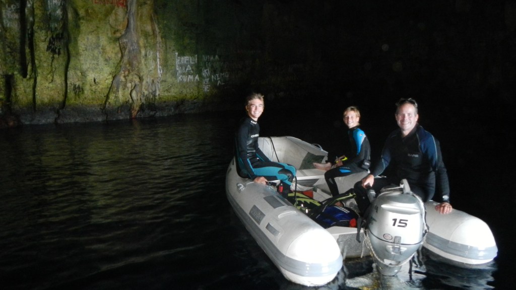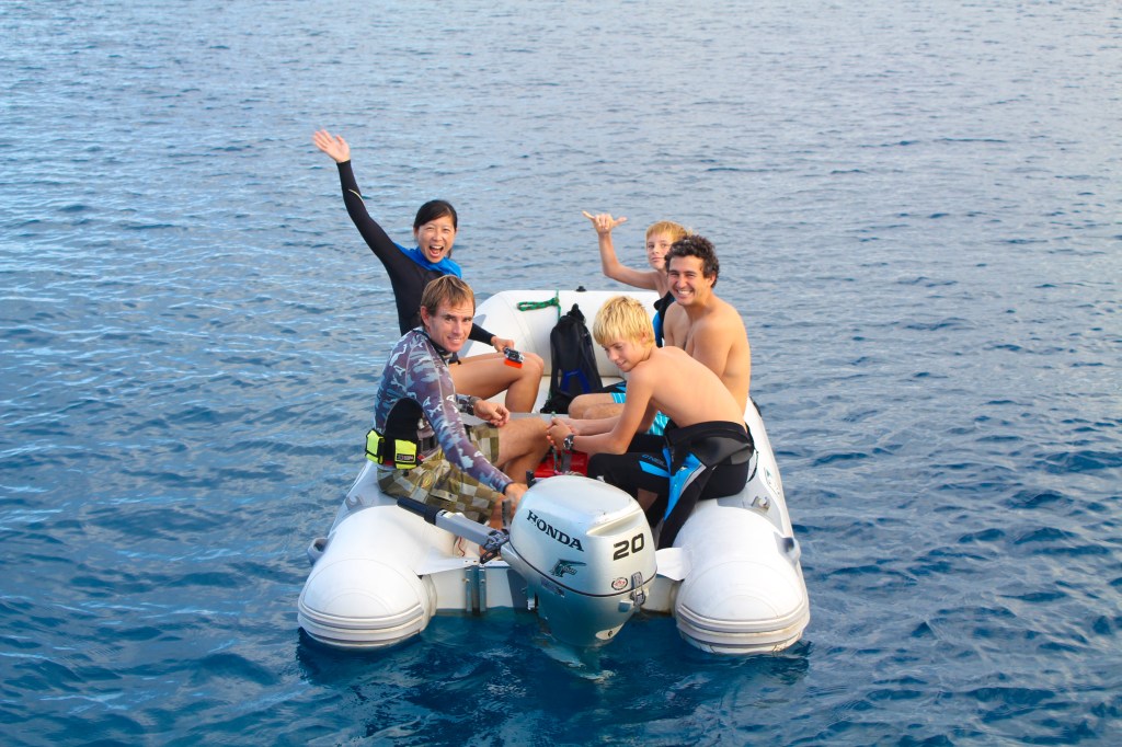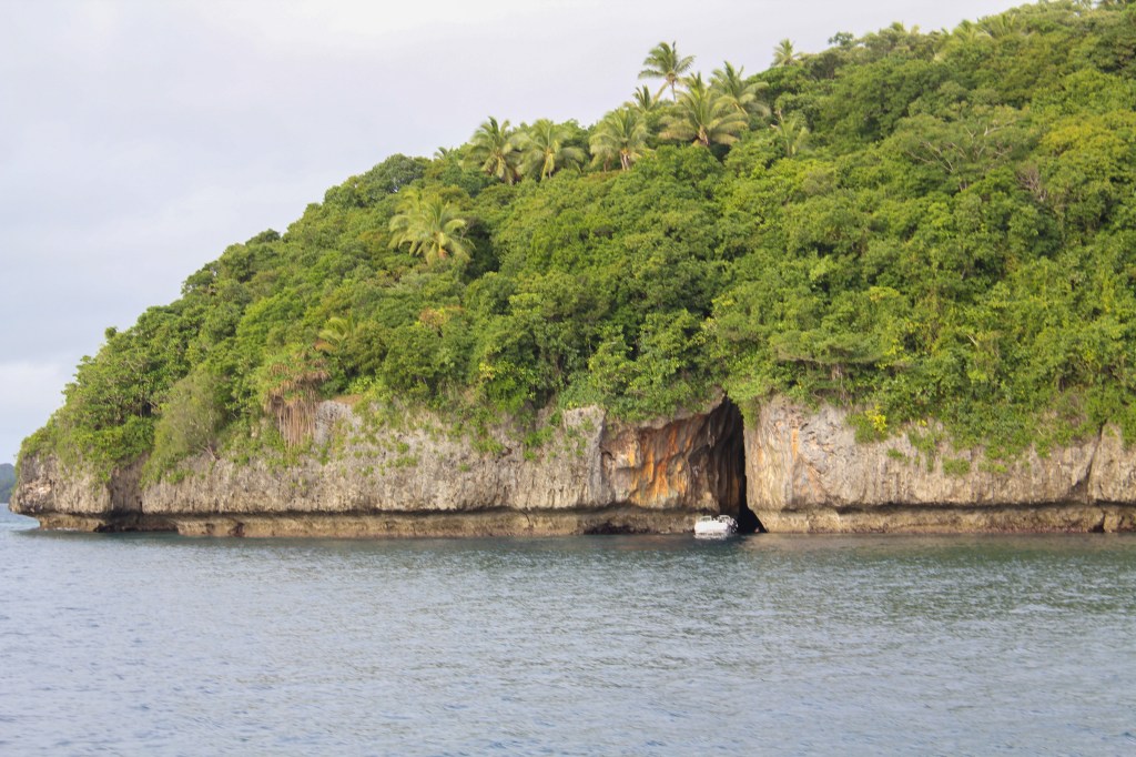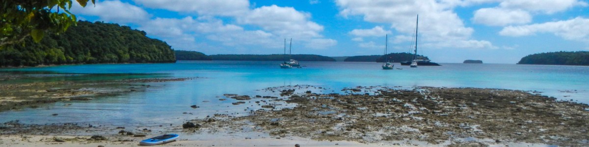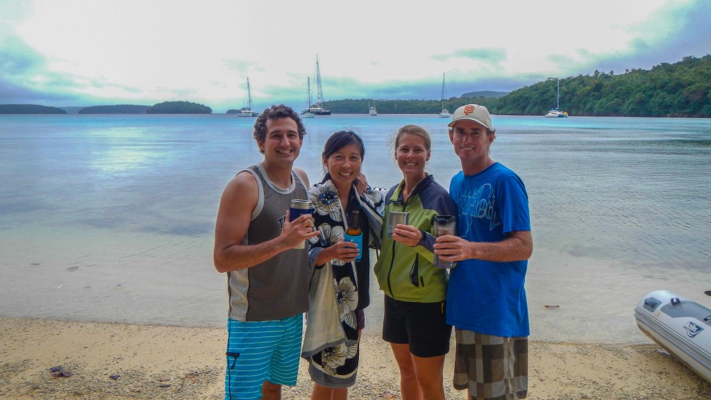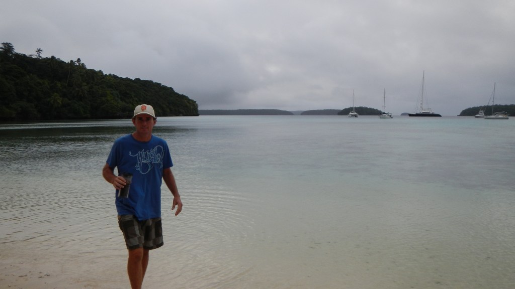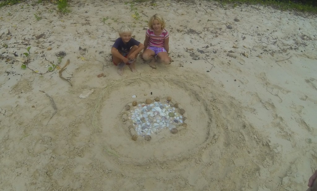 Our friends from home, Yi and Johnny (who used to do the Catalina charters with us), are here to visit. They arrived yesterday, and after a nice long lunch at The Aquarium Cafe and a quick walk into town for beer and fruit/veg, we motor sailed around the corner about 6 miles to an anchorage called Port Mourelle. There are 4 other boats here, 5 if you count the fact that one is a mega yacht and their “tender” is a full on fishing boat. Our German friends with the two girls that we met in Suwarrow are here, and we did a shore excursion in the evening and brought the girls along with us, so Brenden had some dig in the sand buddies. However, these girls did not just dig, they decorated. In what seemed like just a few minutes they had made a beautiful little shell garden. After we got chased off the beach by the mosquitoes, we seared up the last of our yellow fin for a huge tuna feast, and today we are going to do some cave snorkeling. The sun looks like it might come out for us today, so keep your fingers crossed.