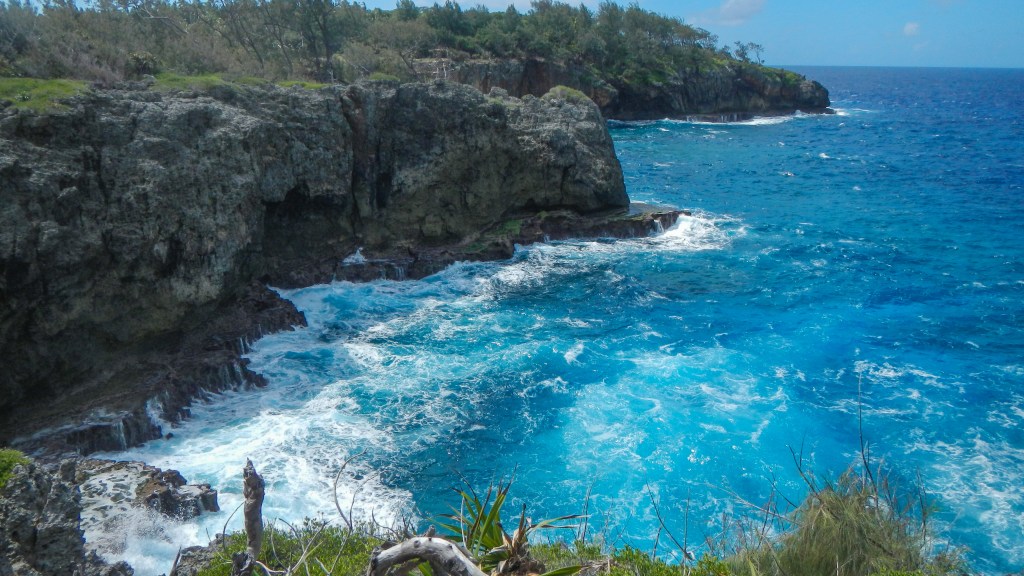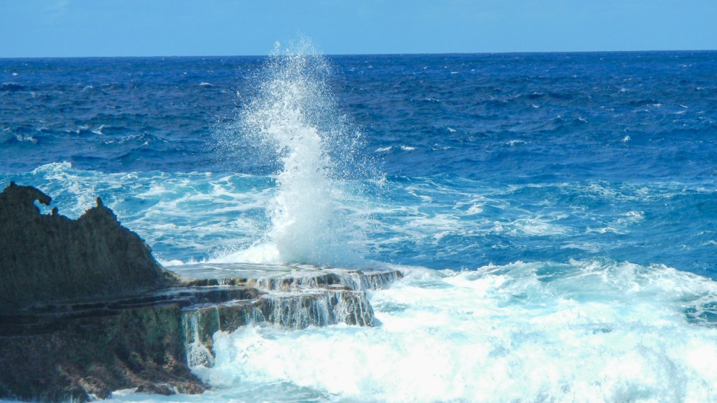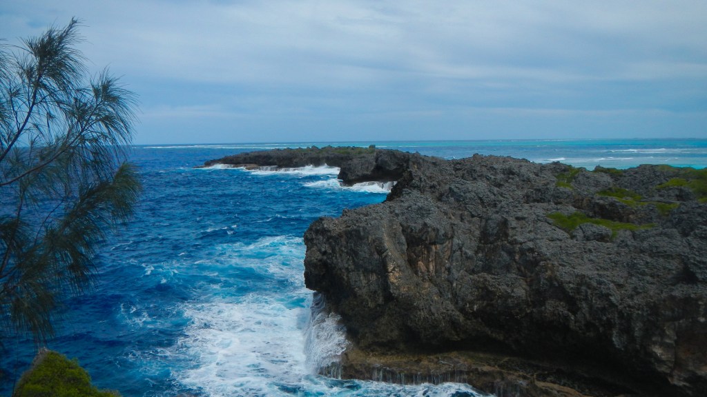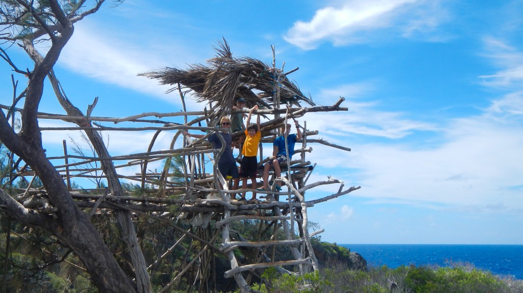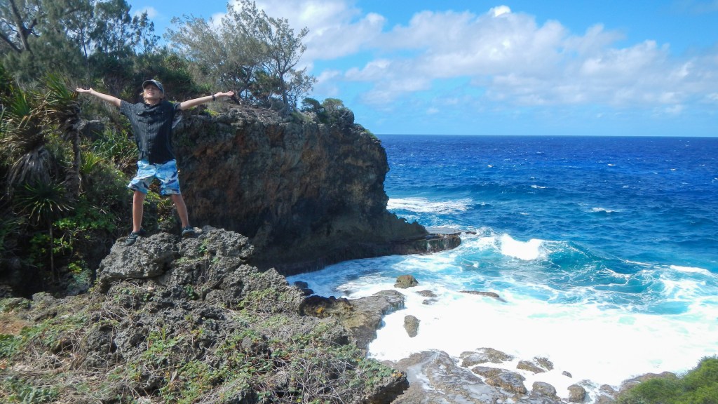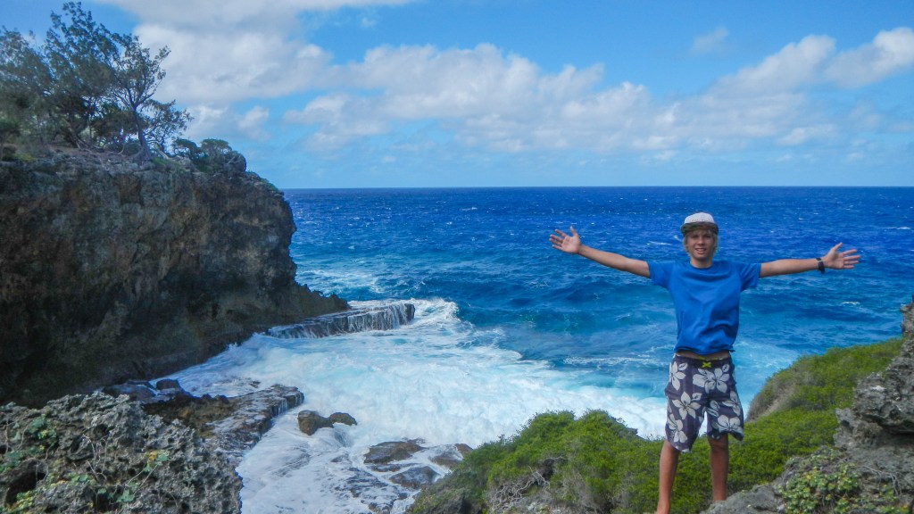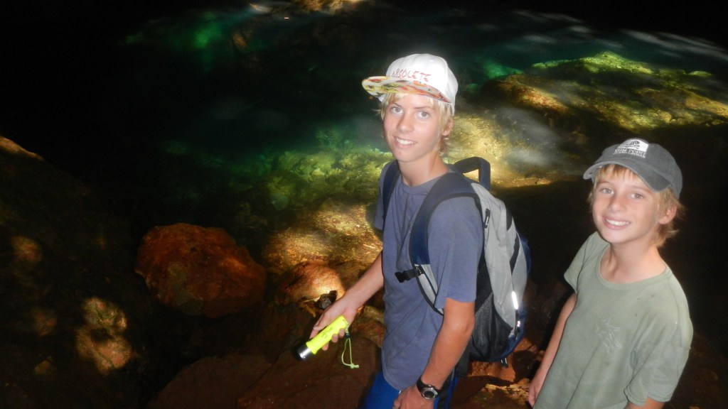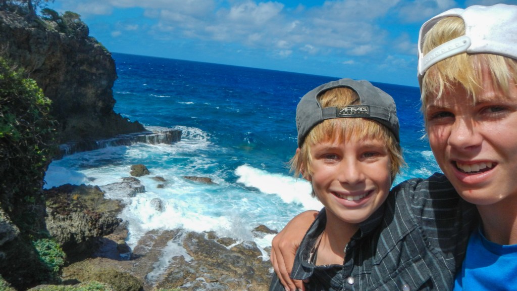 There’s something to be said for having an anchorage all to yourselves. And this one is pretty special, I’m surprised no one else has shown up in the last 24 hours. Night before last we had another boat that played loud country music, but last night it was just us and the sound of the surf. Yesderday morning, Tim and Brenden went spear fishing yesterday and came back with another Rock Cod. Then in the afternoon, we all dinghied up to the next island, called ‘Umuma, and hiked around and climbed down into a huge cave with a fresh water pool inside. At least the guidebook said it was freshwater, none of us tested it to be sure.
