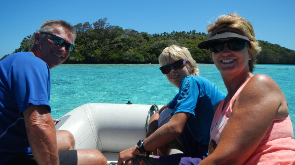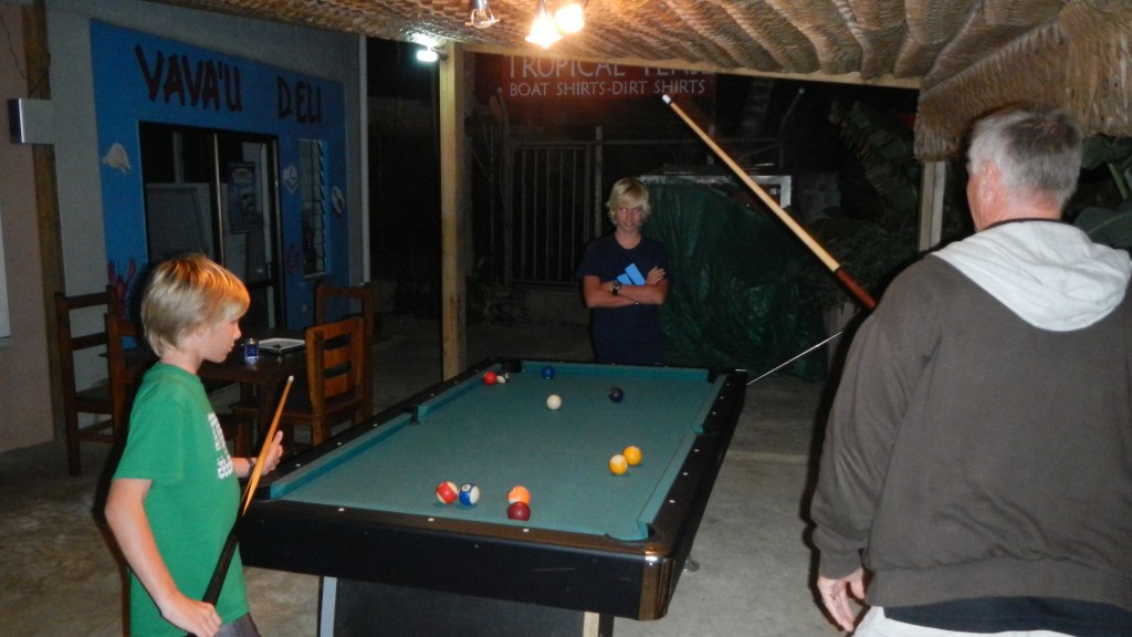 We spent night before last out at Avalau island (anchorage #40), and we all agreed it was the most beautiful spot so far. The water was shallow with turquoise water for about 2km to the south where it met a reef with crashing waves. Best of all we heard whales in the night, and in the morning Karen asked me if it was real or she was dreaming. You see, they’ve been here almost two weeks and the only sign of whales we’ve had are the whale watching boats zipping around everywhere. Then yesterday, as we were getting ready for lunch we spotted spouts and dorsals well off our stern, so Tim took dad and Karen on a rather bouncy dinghy ride out to see them. They didn’t get too close a look, since they got shoed off by a tour boat, but at least they saw whales, finally. After lunch we went to a cove on the island of Ovaka for snorkeling, and it was amazing, definitely giving the coral gardens a run for its money. And we didn’t even have to swim over a shallow reef to get there! However, it wasn’t practical to anchor Exodus there, so since Tim had snorkeled there the day before he volunteered to drop us off and babysit a drifting Exodus. We ended yesterday anchored in the Hunga lagoon, but we’ll need to head to town later today, since, sadly, Dad and Karen leave tomorrow morning.
