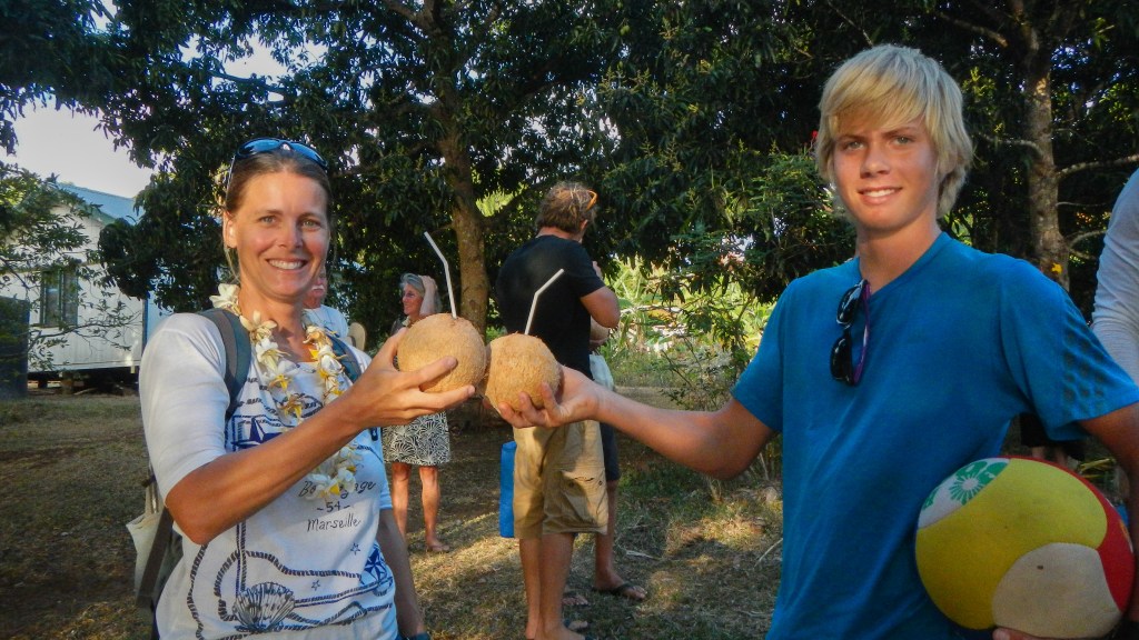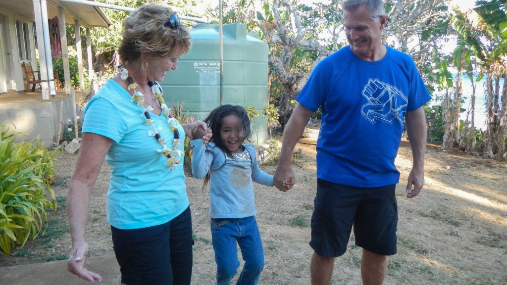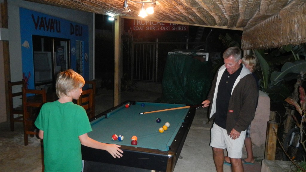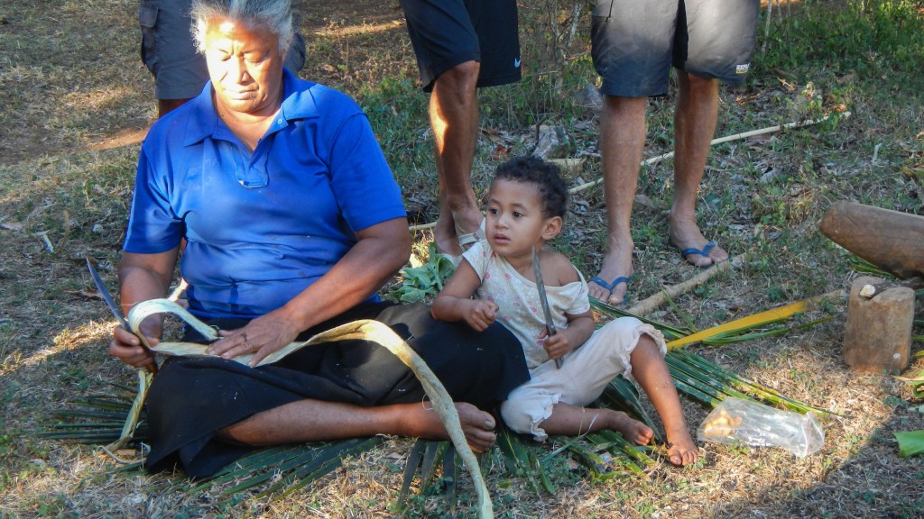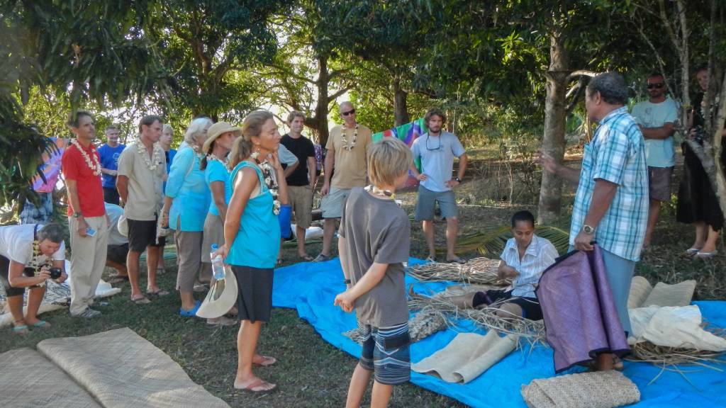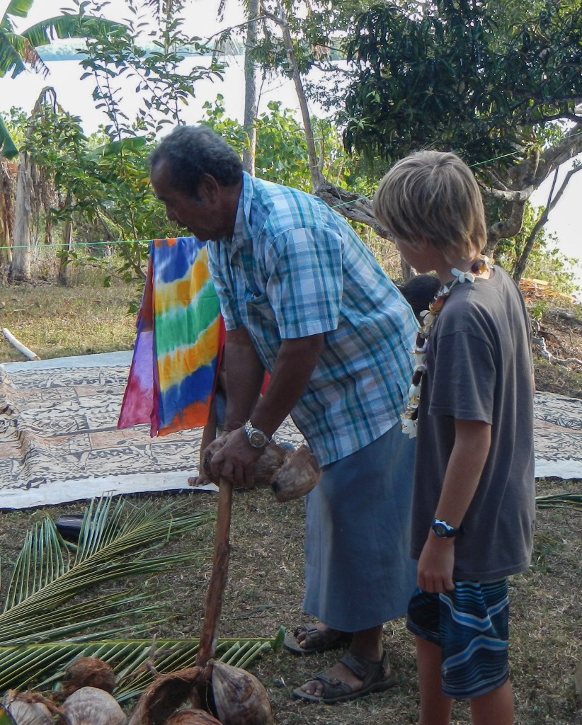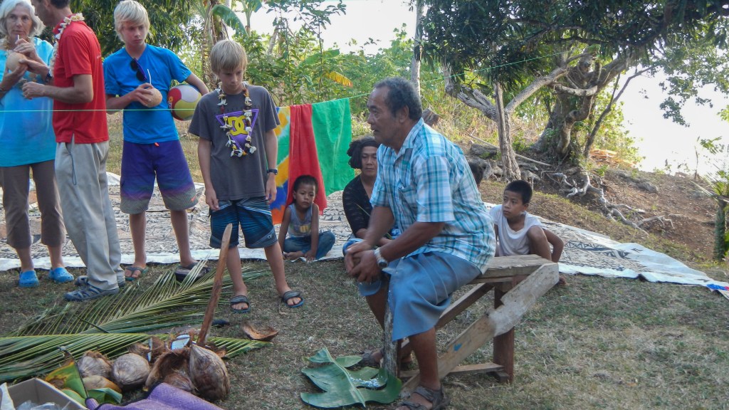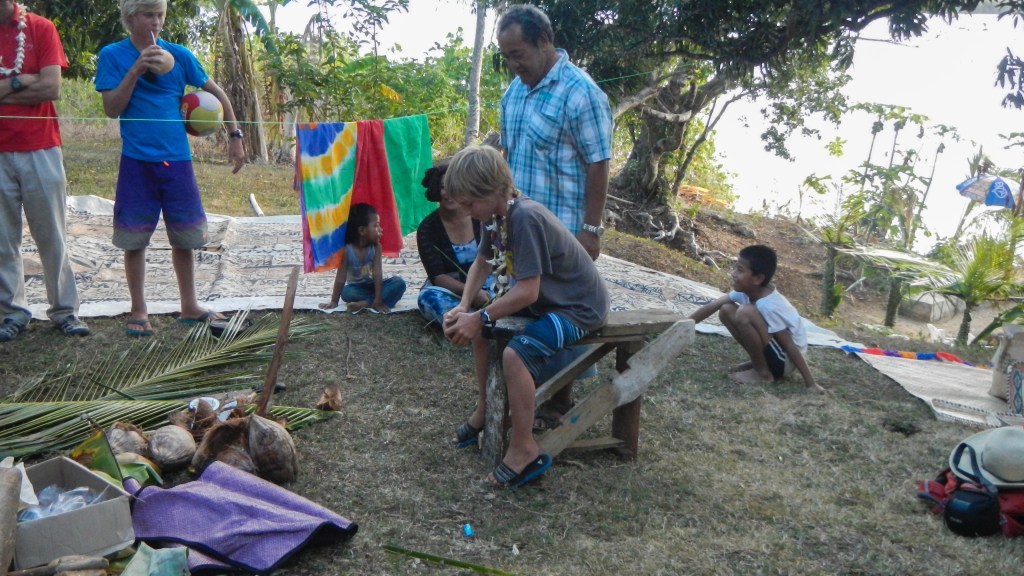 We attended another Tongan feast yesterday evening, and this one couldn’t have been more different than the previous one. It was on the small island of Lape in a village of only 27 people (5 families, a teacher, and a minister). They put on these feasts in order to raise money for village projects, like a new wharf, which is complete, and sanitation, or a public restroom, which is also complete, they just need it to rain in order to have water to use it. They greeted us at the wharf with leis, gave us a tour of their village, gave us a demonstration of tapas making and coconut husking, and Brenden was the first to volunteer to try it, of course. There was a little girl who spotted the grandparents immediately and had my dad and Karen holding each of her hands while she jumped and they lifted her off the ground. She was adorable. The dinner, while superior to the previous feast, still wasn’t exactly our cup of tea, but we didn’t leave hungry. The only thing it was missing was the Tongan music, but that didn’t stop all the cruisers from hanging out and having a good time anyway. Today is supposed to be light winds, so maybe we will snorkel the coral gardens again.