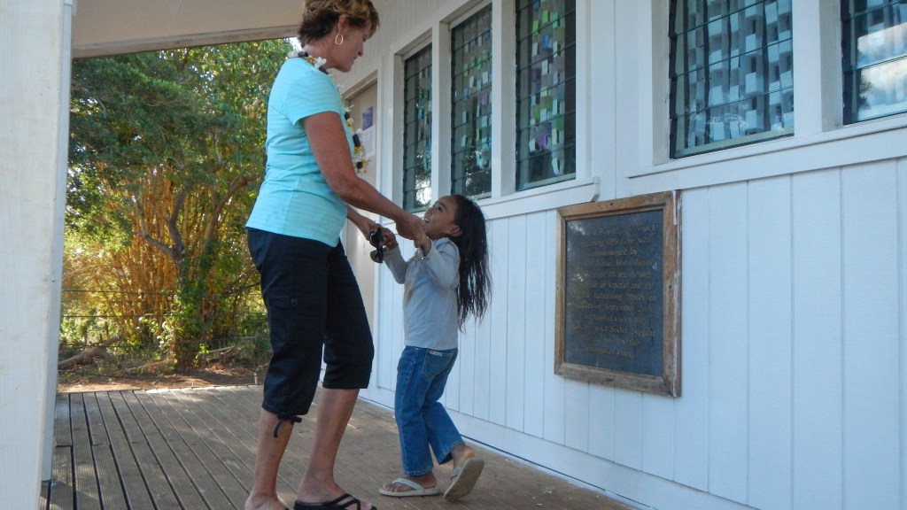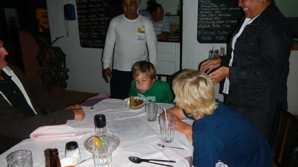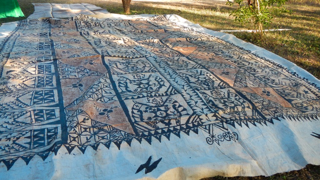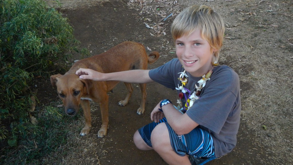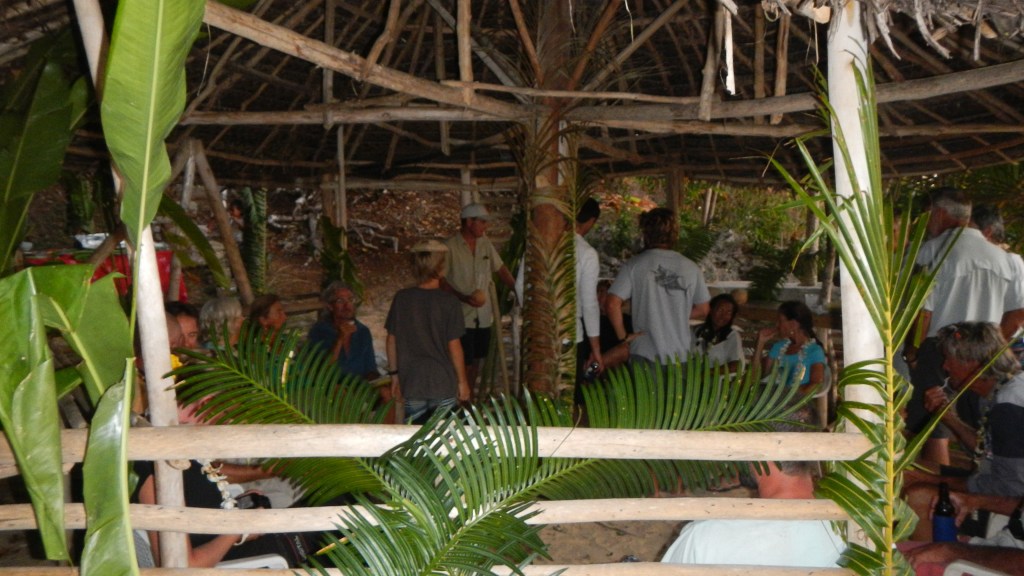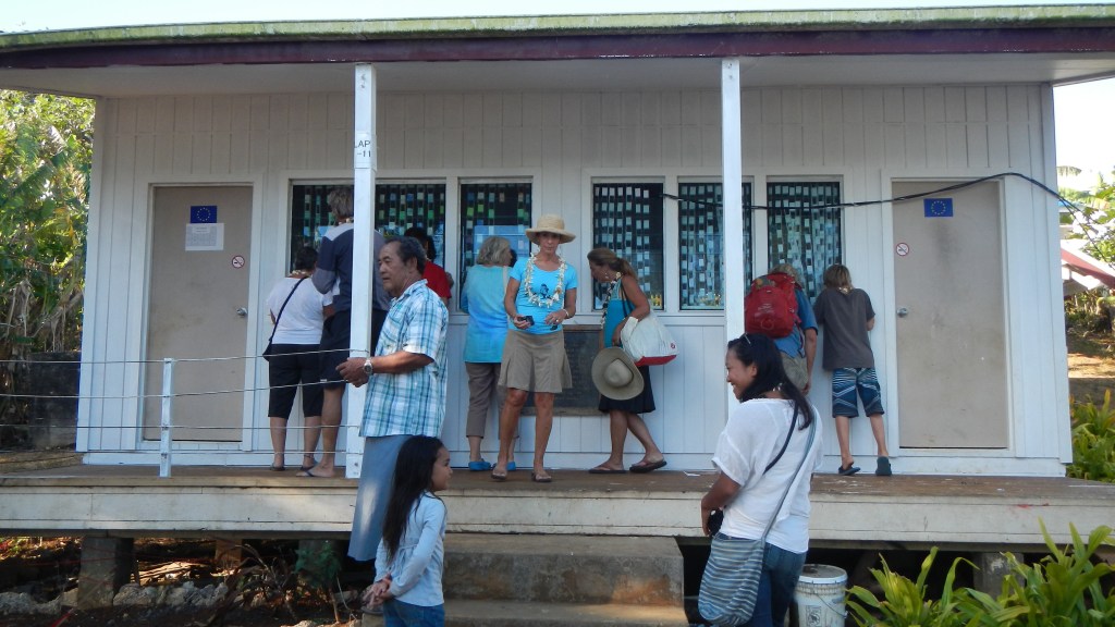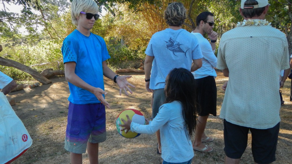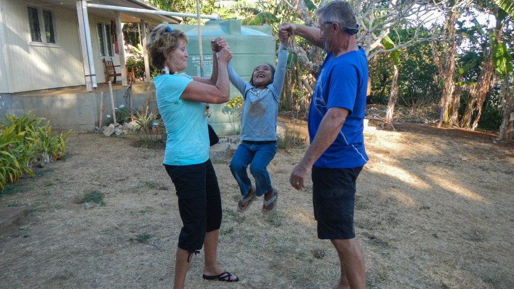 We attended another Tongan feast yesterday evening, and this one couldn’t have been more different than the previous one. It was on the small island of Lape in a village of only 27 people (5 families, a teacher, and a minister). They put on these feasts in order to raise money for village projects, like a new wharf, which is complete, and sanitation, or a public restroom, which is also complete, they just need it to rain in order to have water to use it. They greeted us at the wharf with leis, gave us a tour of their village, gave us a demonstration of tapas making and coconut husking, and Brenden was the first to volunteer to try it, of course. There was a little girl who spotted the grandparents immediately and had my dad and Karen holding each of her hands while she jumped and they lifted her off the ground. She was adorable. The dinner, while superior to the previous feast, still wasn’t exactly our cup of tea, but we didn’t leave hungry. The only thing it was missing was the Tongan music, but that didn’t stop all the cruisers from hanging out and having a good time anyway. Today is supposed to be light winds, so maybe we will snorkel the coral gardens again.