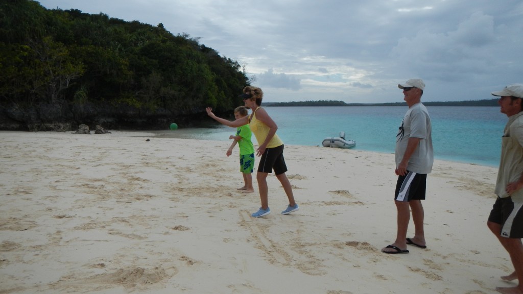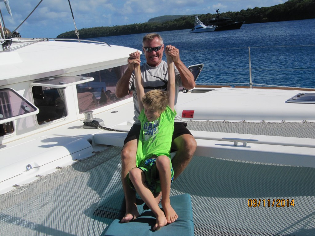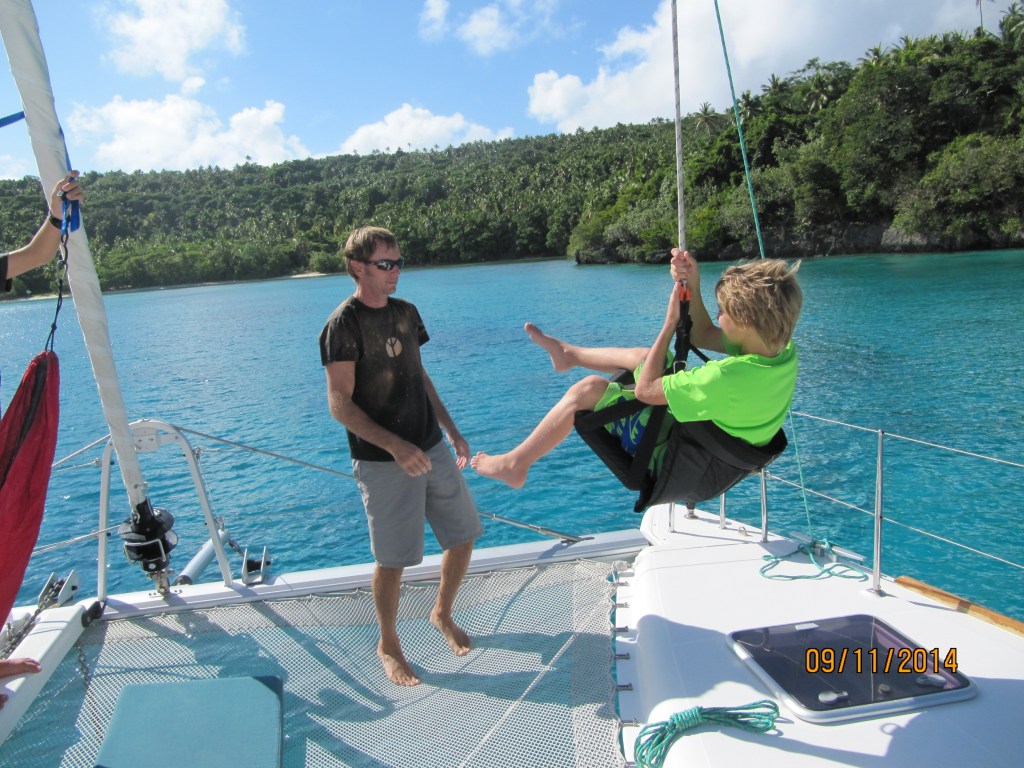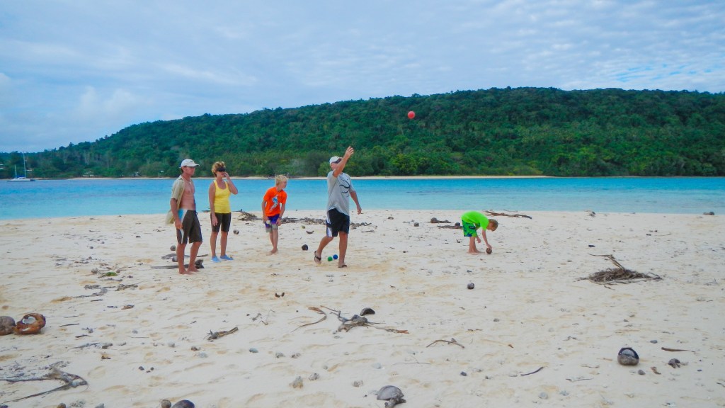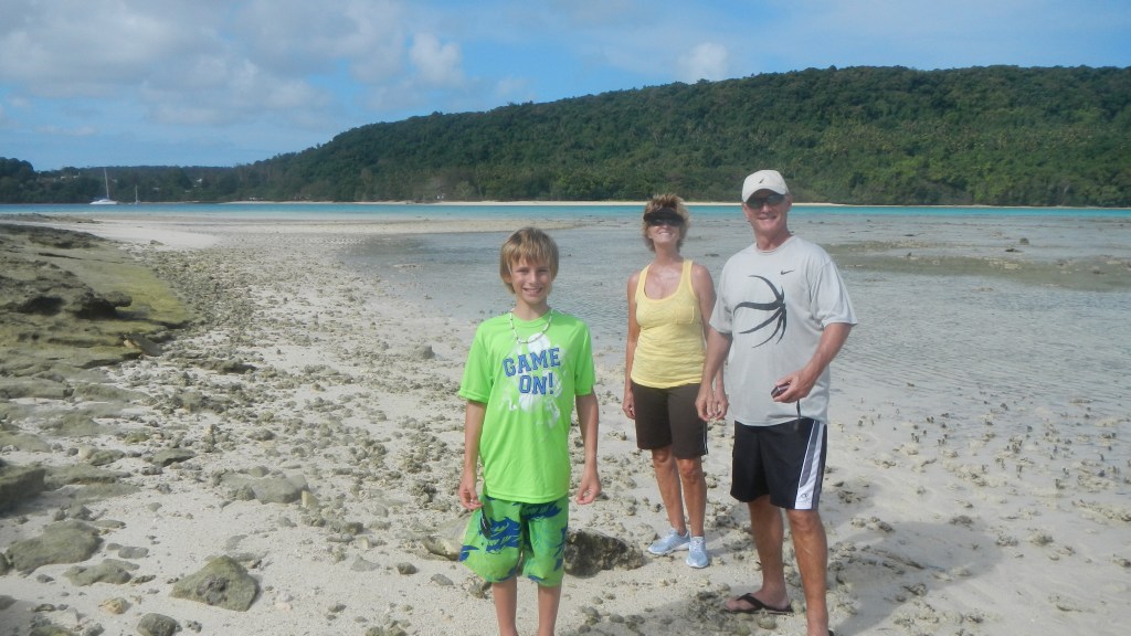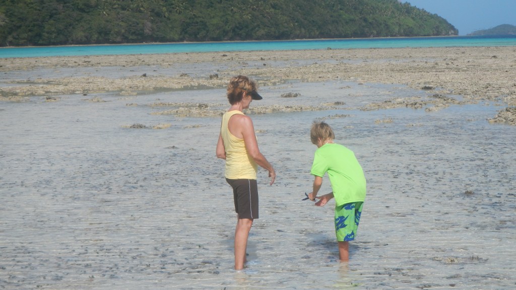 We are out at Kenutu again, because it’s one of our favorite spots. We joined 2 other kid boats when we arrived, and all the kids spent all afternoon on the beach husking and grating coconuts in order to make coconut macaroons over on Dafne. They all worked hard on it, but Alex and Brenden didn’t even mind that they didn’t really like the macaroons at all. We’ve taken my dad and Karen all around both islands (Kenutu and ‘Umumu) for some jungle trekking and spectacular views. Evenings are filled with dominoes, cards, and sometimes some heated political conversation. Of course, Tim and I have been out of it for so long we are at an information deficit. But I guess that could be a good thing.