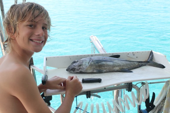We went out snorkeling and spearfishing as a family, and as soon as Brenden was in the water, he shot a really nice-looking fish. Tim was so excited, he was yelling, in that proud/excited dad way, for me to throw him the go-pro, “just throw it!” Turns out it was a big eye trevally, not so tasty, so after Brenden cleaned it and we realized what it was, he fed it to the shark. I didn’t see this one, but Brenden keeps talking about it, the one that got away. Apparently, he shot a huge Almaco Jack, but it was stronger than him, and it took his spear. I think he probably dreamed about that fish at night. (Spoiler alert: He talked about that fish all summer long in New Zealand, and he WILL redeem himself when we stop again at Minerva Reef on our way back north.)