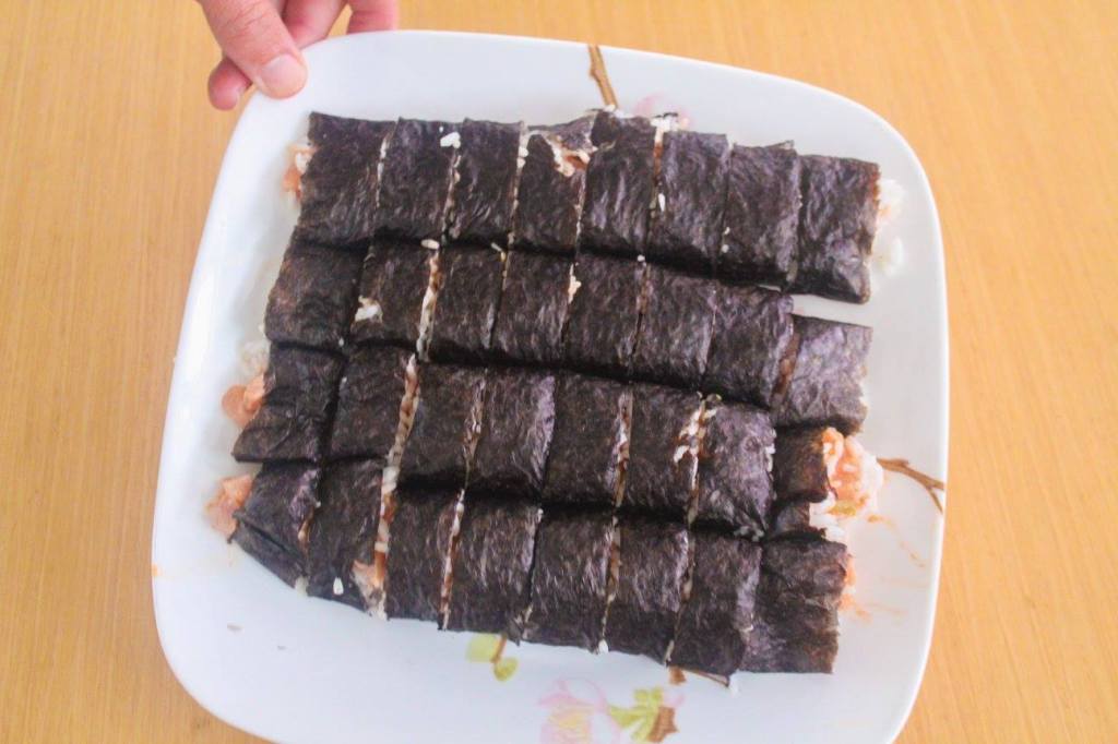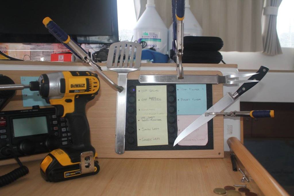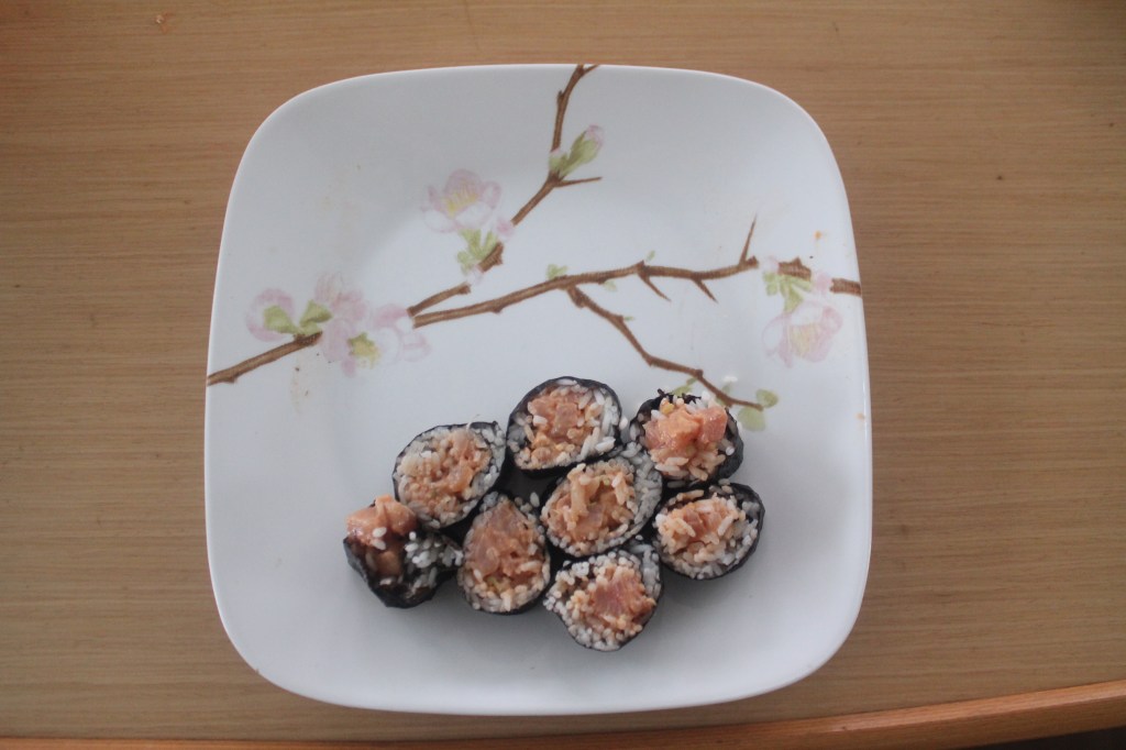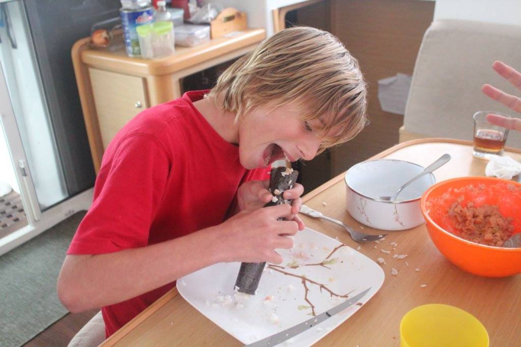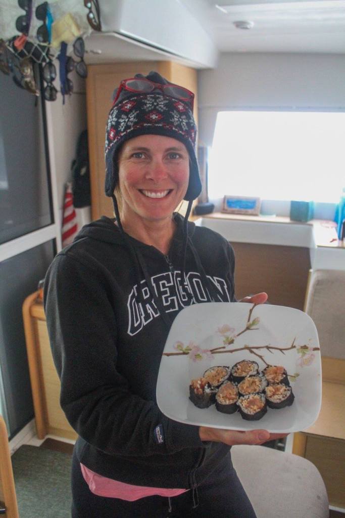 We never left the boat while we were in this cove, because it was rainy and blustery (gale force). But we passed the time with boat projects and sushi rolls.