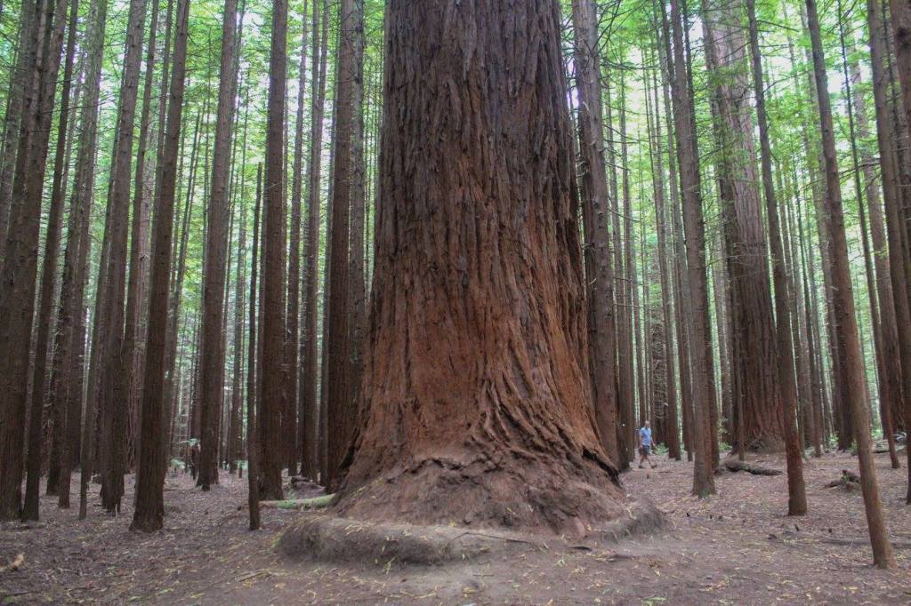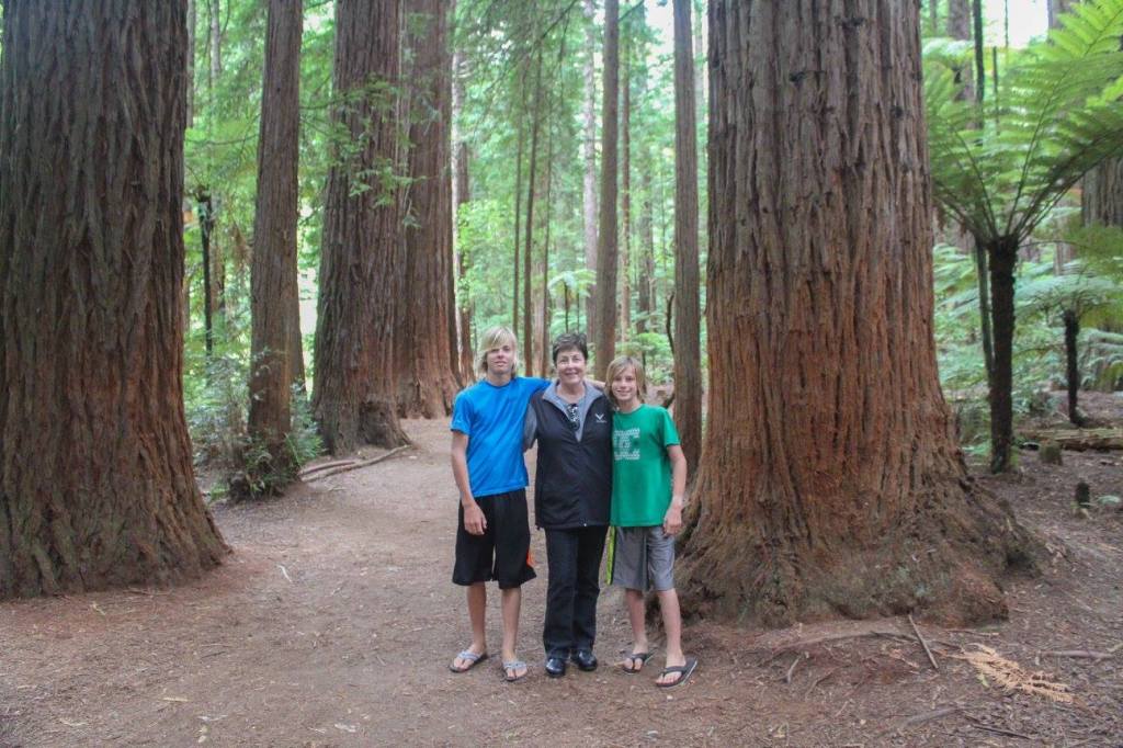 We went all the way to New Zealand to see California Redwoods! We spent an afternoon hiking around Redwoods Whakarewarewa Forest, which is one of the few FREE activities around Rotorua. This photo is actually of the bathrooms at the visitors center.Ready for a hikeThis group took the hour long flat “blue” hike, while Tim, John, and I took the two hour “yellow” hike.A view from the “yellow” hike. In the foreground is Te Puia, a thermal reserve including geysers. Behind that is the town of Rotorua, and behind that is a view of Lake Rotorua.A view of Pohutu, the biggest geyser. We waited for about 20-30 minutes hoping to see it erupt, but this was the best we got. Beats paying $50 to go into the park, I suppose.
