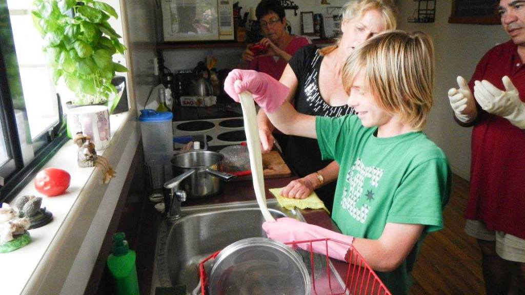 House day! After a couple days of running around, we decided to spend a full day just hanging out on the farm. This photo was taken during a very heated cherry pit spitting competition.Mozzarella cheese makingIn the photo with John is Kathryn Tuck, the owner of the Farm.Brenden gives it a good stretchNot to be outdone, Alex goes for an even longer stretchThe cheesemakers with their productAfter cheese making, we walked down the road with all of our food scraps to feed Pinky the SowSo, I cannot adequately describe my surprise when we walked up to the pig pen and saw how big Pinky was. She heard us coming and greeted us at the gate and vigorously chewed on the fence until we gave her somthing to eat. We didn’t enter the pen, because she was big and scary, but also because…… she had piglets that were just a few days old. So, she would have been even more aggressive and scary than usual.We just filled her trough and watch her go at it.Tim and the boys even fed her by hand, being very careful not to lose a finger, or a whole hand.Pinky made the most happy smacking eating sounds I’ve ever heardAlex tried to get her to jump up. Her little legs were going and going, but it turns out that pigs can’t jump.A view of our house from down by the dairy shedWouldn’t want to run into these ladies in a dark alleyMac the farm dog. We could always hear him barking away when the cows were coming to or going from the dairy shedSunset reflection over Tuck FarmWhy yes, that IS Tim hanging clothes out to dry