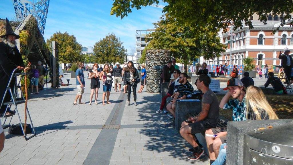 - Cathedral Square. Street performer Sport Suzie. Arguing zealots Christians x 2 vs. non-believing wizard.