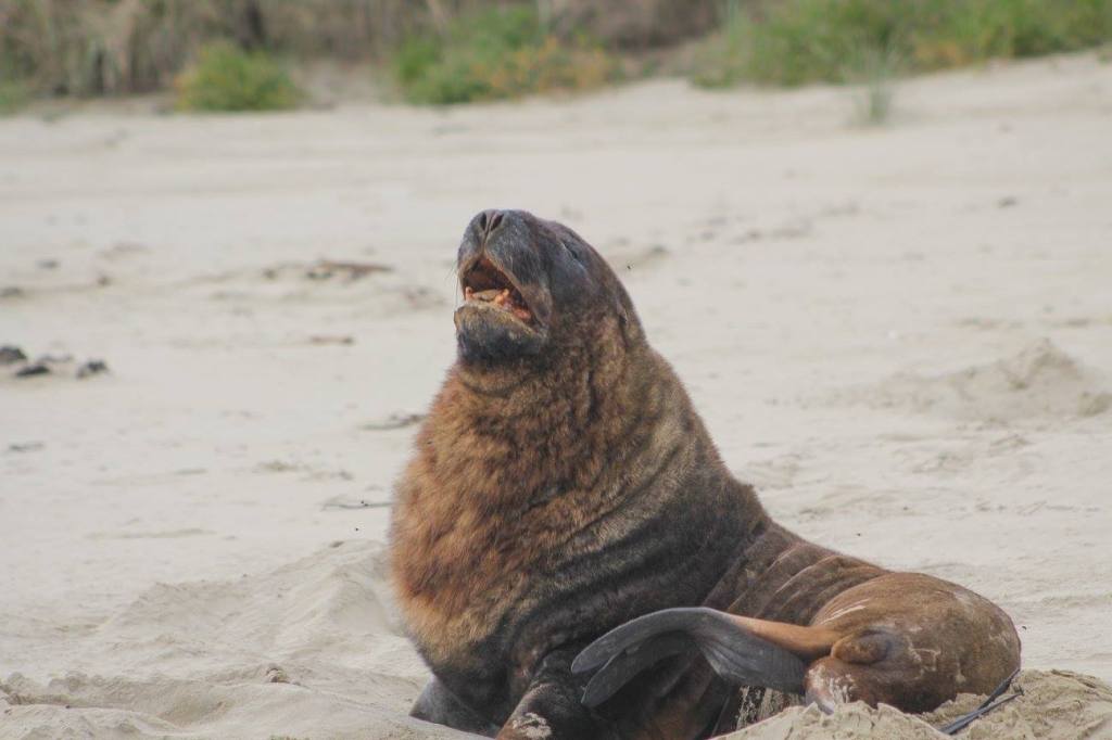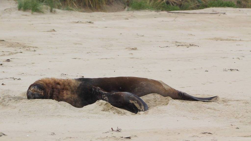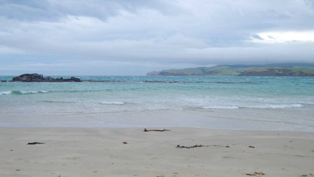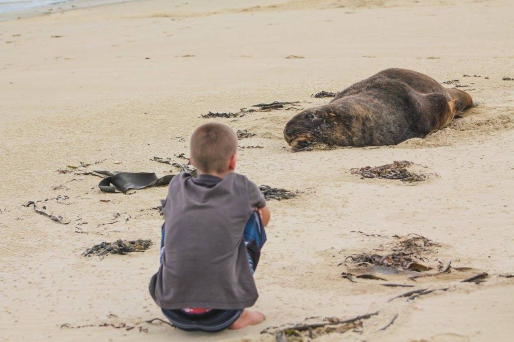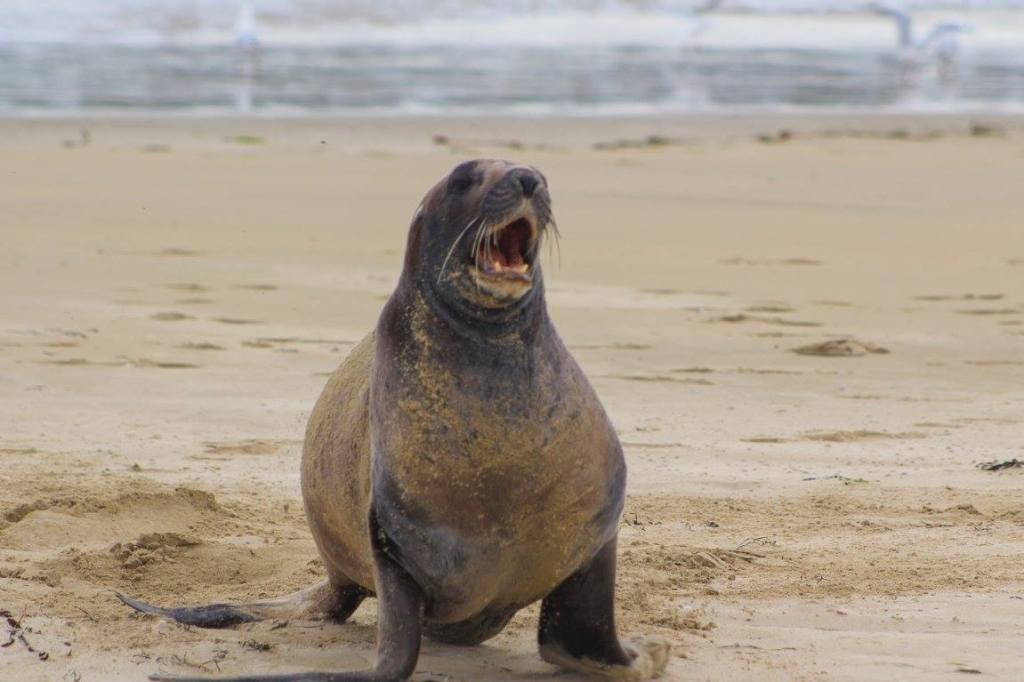 Easy beach access from the holiday parkPoor bird lost a footWe took a long walk along Surat Bay and then over the ridge at False Islet over to Cannibal Bay. The highlight was definitely……The sea lions!Tim provoked this oneThis guy is laying on his backTaking the trail between Surat Bay and Cannibal BayCannibal BaySurfin inPermission granted to return back to the holiday parkIt was kind of tricky passing this oneThe weather changed instantly on us. It went from warm, muggy, and not much wind to ice cold and about 25-30 kts. This photo tries to capture the wind chop on Surat Bay, but it doesn’t do it justice.Back at the holiday park
