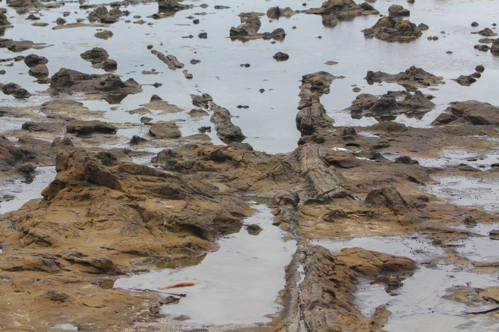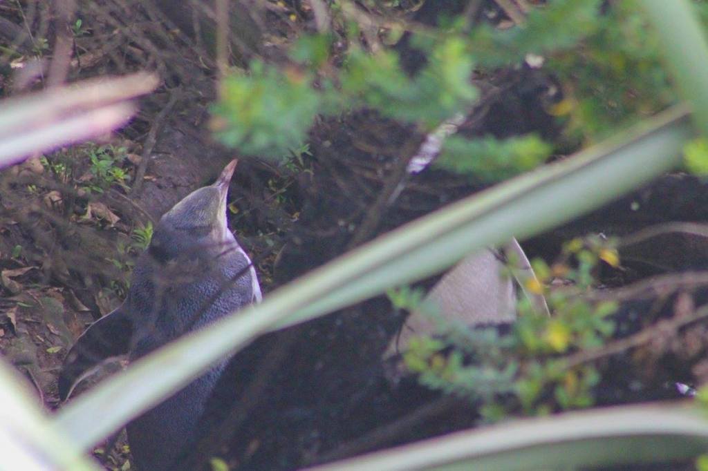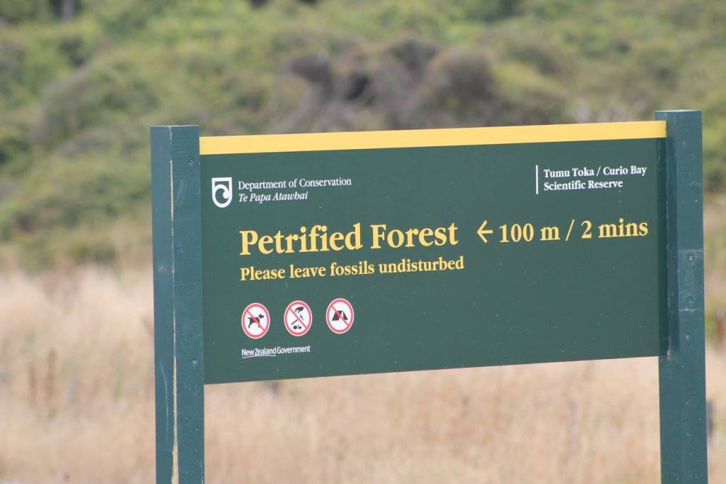Curio Beach. Drove thorugh campground to lookout. Stopped to see fosslized trees. Spotted 2 yellow eyed penguins in the bushes.