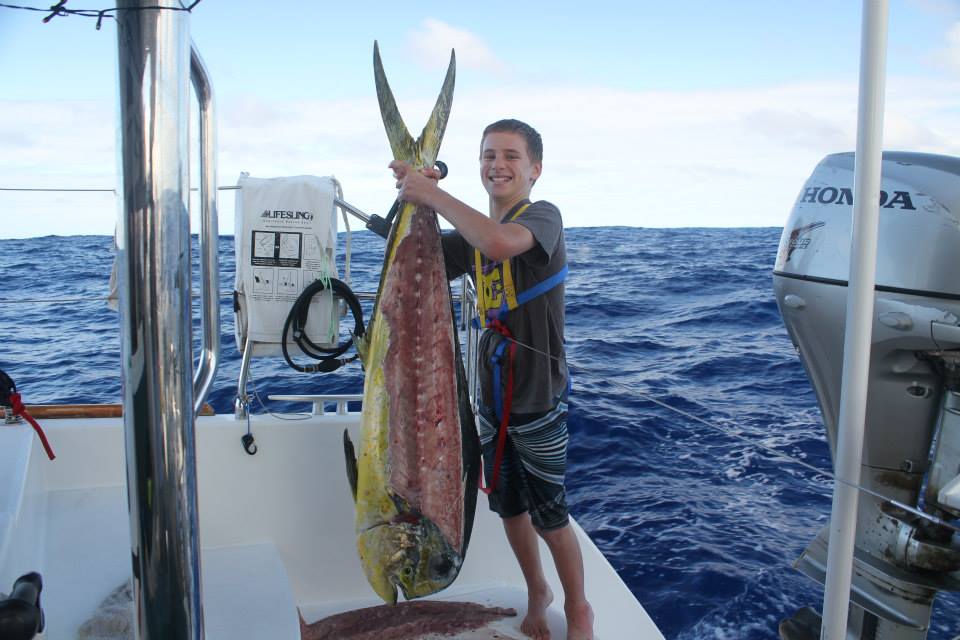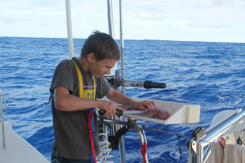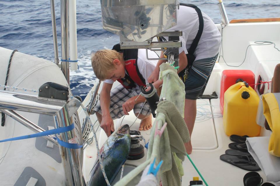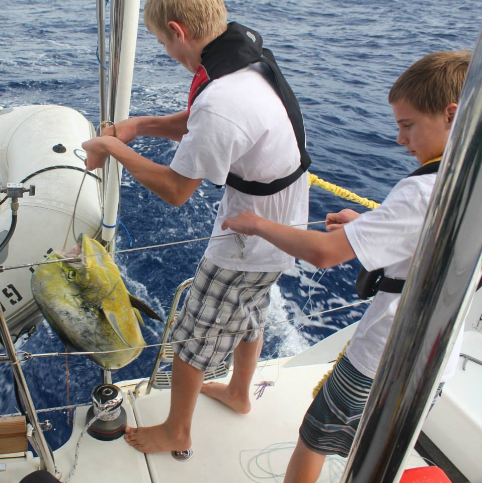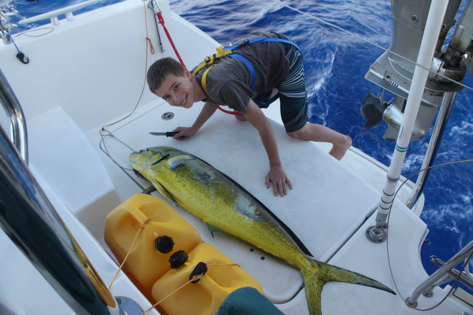 Today’s excitement was a 4.6 ft Dorado (Mahi Mahi) that the boys landed while Tim was asleep. Brenden was the only one up when I saw the fish being dragged behind us on the handline. I told Brenden, he harnessed up and clipped on, and then started the business of pulling it in. As it got close and we saw how big it was, we realized we couldn’t handle it just the two of us, so I woke Alex. And let me be clear… I was the weak link in that operation, not Brenden. Well, Alex and Brenden managed to get it on board, but not after I annoyed the hell out of Alex asking if I should wake Dad. He was struggling to lift the fish up after he got it on the stringer. But I think my suggestion of waking Dad opened his reserve fuel tank, because his next heave up was successful. Brenden cleaned the whole thing, and we enjoyed BBQ Dorado with Creole seasoning. Just like old times.