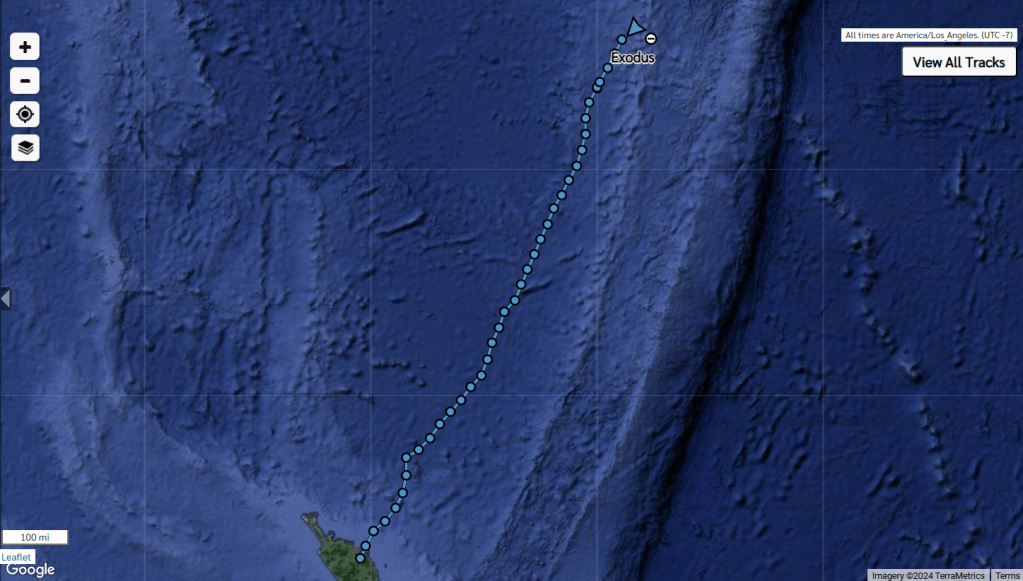 We had a smooth departure process, and after we had loaded up our duty free alcohol delivery and did final stowing, we pushed away from the dock in Opua around noon. We stayed just one night at the dock, because that way we could get our duty free diesel the day prior to leaving and didn’t have to worry about it on departure day. Overall, it hasn’t been a bad start. The sea state is bigger than the corresponding wind due to the low that just blew by, so we are rolling around a bit. But when I was laying in bed earlier I noticed that at no time was I catching air, so in that case this doesn’t even come close to some of our worst seas. Even though the winds are pretty light, we are still reefed, because we have quite a bit of squall activity around us.