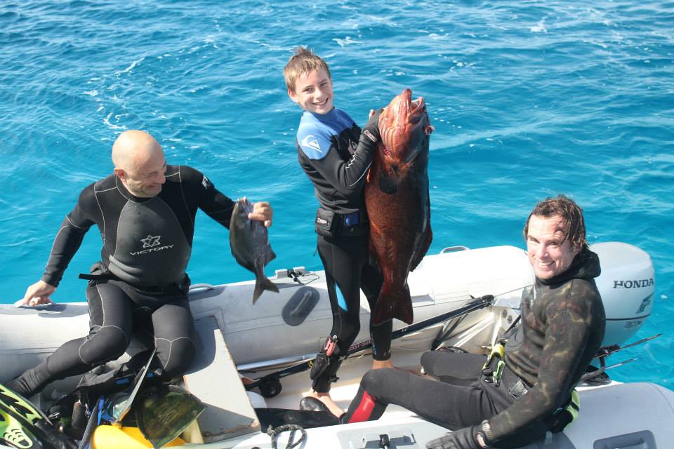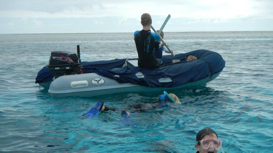 - Family snorkel w/ Field Trip and Lumbaz. Alex plays with kids, throws Noa in the water. T- spearfish (jobfish)