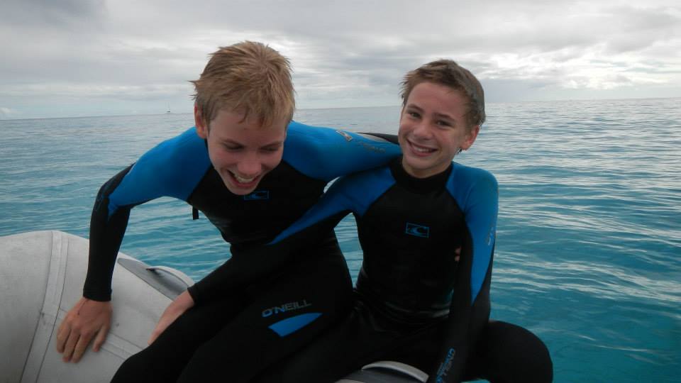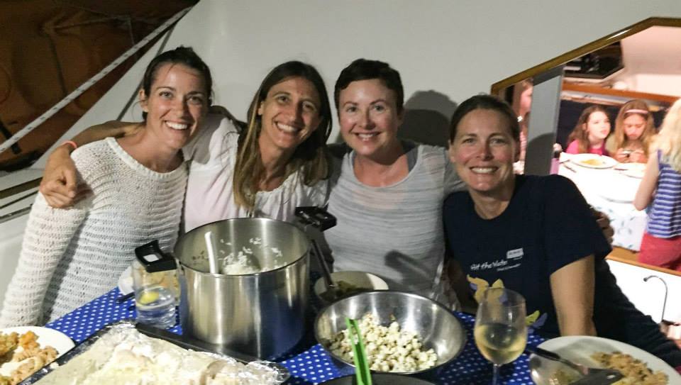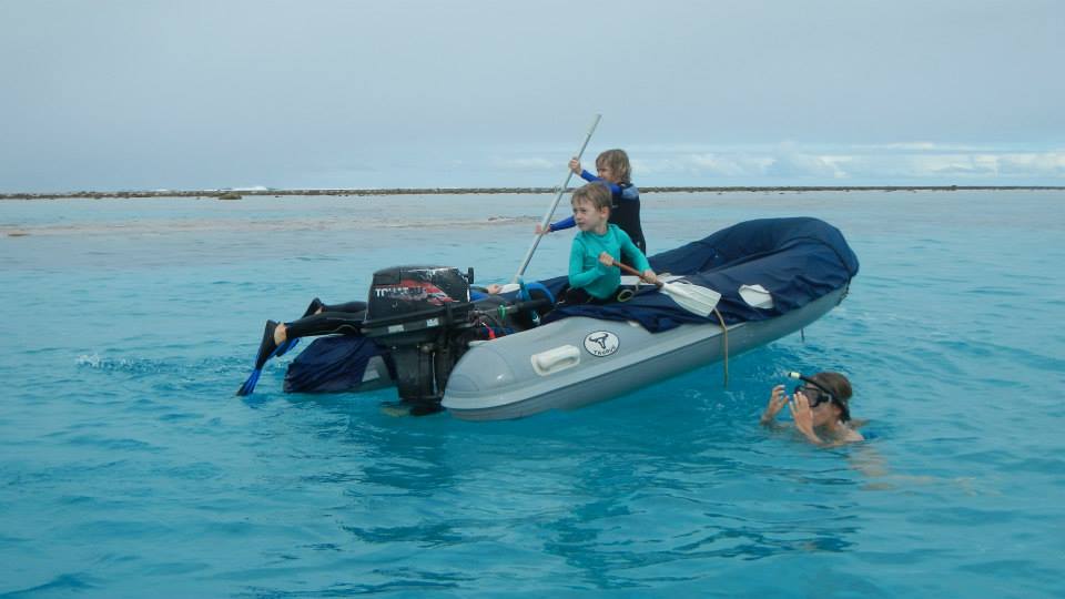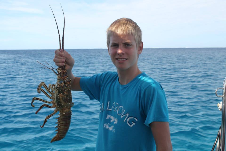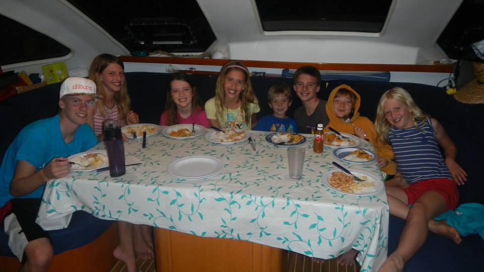 We had a great day here, but we were so spoiled with beautiful weather last year during our Minerva stop that it’s hard not to notice the difference. The snorkeling is, of course, amazing, and while Tim and Brenden didn’t shoot the tuna they were looking for, Tim did get a jobfish, which was a tasty addition to the potluck we had on Lumbaz last night. It is so much fun watching all the kids together, they reminded me of a group of cousins getting together. There were 8 kids last night, Alex the oldest and Nils the youngest (age 5) with boys and girls of all ages in between, and they were all singing and playing and the youngest and oldest were always together. The guys all went for lobsters last night, and Nils wanted to go so bad, and when they told him the other young boy (Michael from Field Trip) wasn’t going hoping then he wouldn’t want to go either, he said, “it’s OK, Alex is going!” So cute! Anyway, there are bags of lobsters hanging off the back of Exodus this morning so it seems they were successful! We intend to move 20 miles away to N. Minerva today.