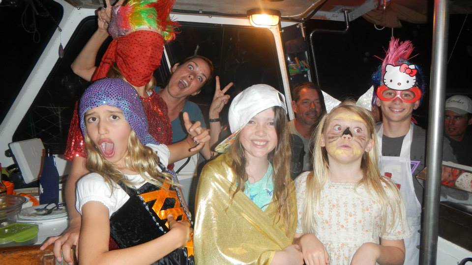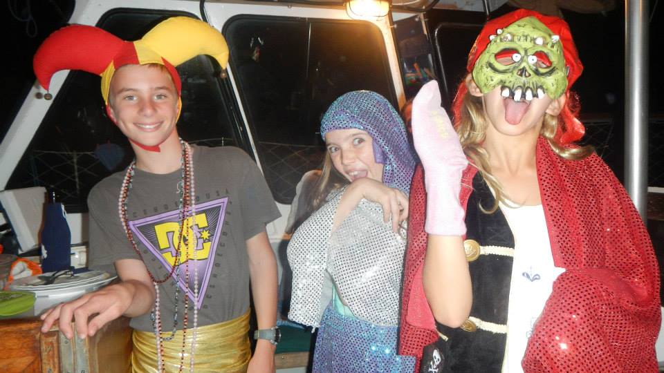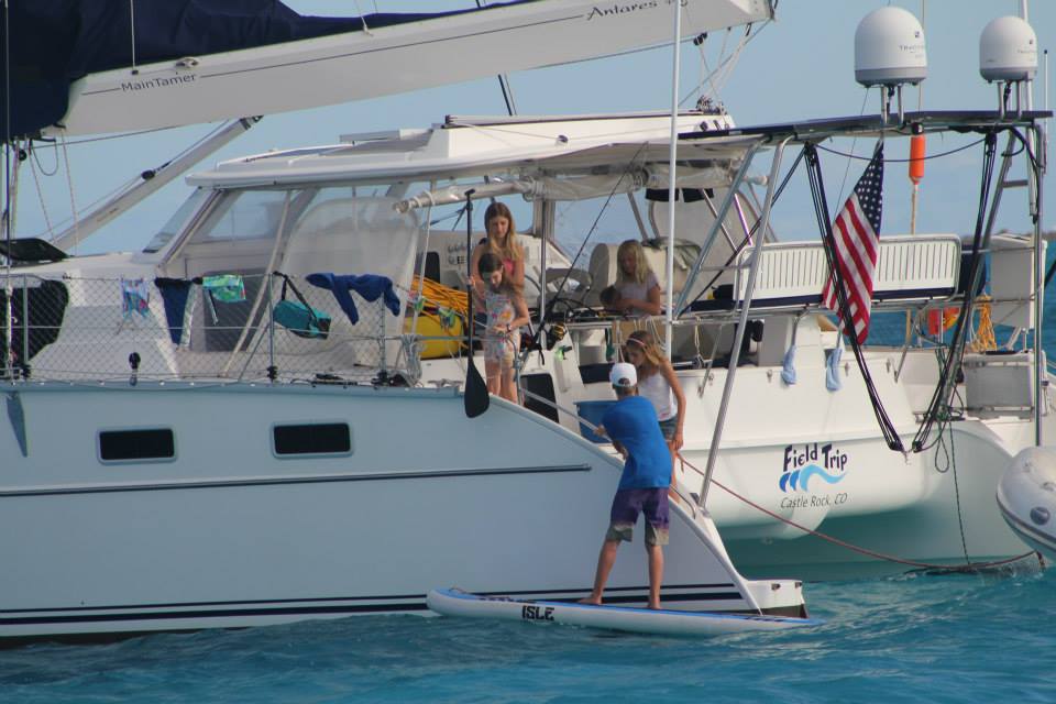 We sailed from south to north Minerva yesterday afternoon, and it was a great day sail and we made good time. And since we had been here before and had our own track and waypoints and knew the anchorage, we sailed up to the pass, jibed, and then sailed on through. The conditions are pretty crappy now with 20 kt winds and a very bouncy anchorage. Yesterday, before we left S. Minerva Tim and Brenden went spearfishing with two of the other dads, and it was pretty funny that Brenden got the biggest fish. A whopping 31 lb. grouper. He could barely hold it up for the photo shots.
