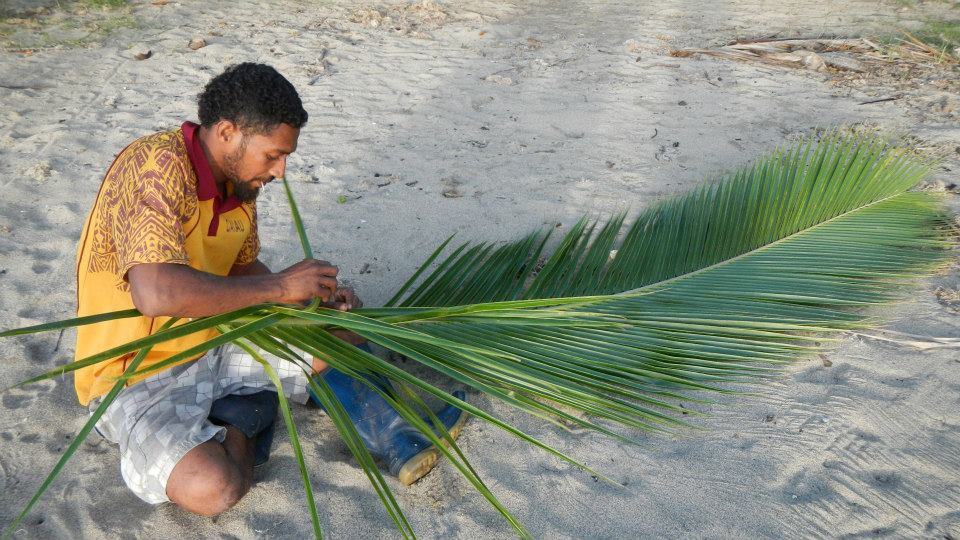 Jesse James was our guide on both hikes, and on the first one just a subset of our little fleet went. It was a nice walk through the lush island, and we passed a papaya “plantation” as well as a huge mandarin (tangerine) tree. We were all a little short of fresh fruit and veggies on board, so it wouldn’t be too much of an exageration to say that we were all drooling over the mandarins. Jesse said if we wanted some, no problem, we could pick some on the way back. So, we made our way over the hill down to the beach on the other side, enjoying pleasant conversation along the way. When we reached the beach, Jesse started to make some baskets out of palm fronds so that we would have something to carry the mandarins in. This is the side of the island where the school is, and since it was just about the time school was getting out, several kids came over to hang around us. There was one young teen girl who spoke a small amount of English, but most of the smaller ones didn’t. So, they just hung around close by and smiled huge smiles like only Fijian children smile. It was relatively low tide, to Axel and Sepe, two boys from other boats, played and explored around the reef, while I enjoyed a solitary walk along the beach. When I got back I found that Gary had decided to learn to make a basket and Jesse was patiently helping him. The rest of us were somewhat ready to go, so we got a head start. Back at the village, Jesse showed up with our mandarins as well as a few papaya. These were all given to us in generosity, without expectation of anything in return. Of course, to show our own gratitude, each family gave something to Jesse as well.