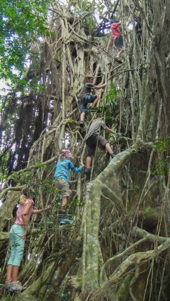 The second hike was a bit longer and a lot more challenging. This time the whole anchorage was there, including Liz with Benjamin in a carrier on her back. I must admit that she was my inspiration many times that day when I found myself struggling for a handhold or slipping on rocks. I just kept thinking to myself, “Suck it up. Liz is doing this with a baby on her back.” We made a few rest stops on the way up, and one was a particularly interesting stop because it was at the base of a huge banyan tree. The kids loved it, because it was hollow up the middle, and they could climb a fair way up to the top of the tree. It was also here that Gary was taken out by a rock. When the climbers ahead of you dislodge a rock such that it starts rolling down, they yell, “rock!” This all came together about a split second too fast, and Gary heard the call, saw the rock, and jumped up over it, but like I said, just a split second too late. Truth be told, we are lucky no one got seriously hurt that day from falling rocks, because falling rocks were plentiful.